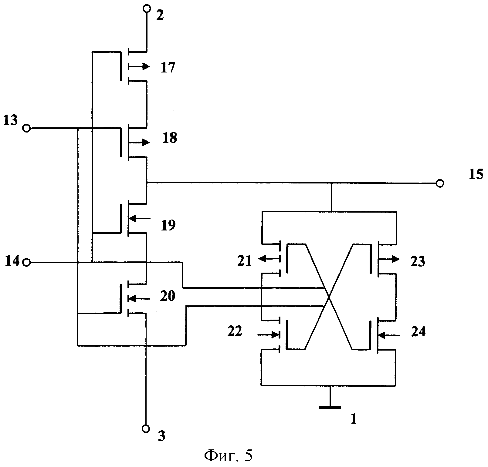 n-проводимости. При этом пороговые напряжения транзисторов такие, что каналы первого 17 и четвертого 20