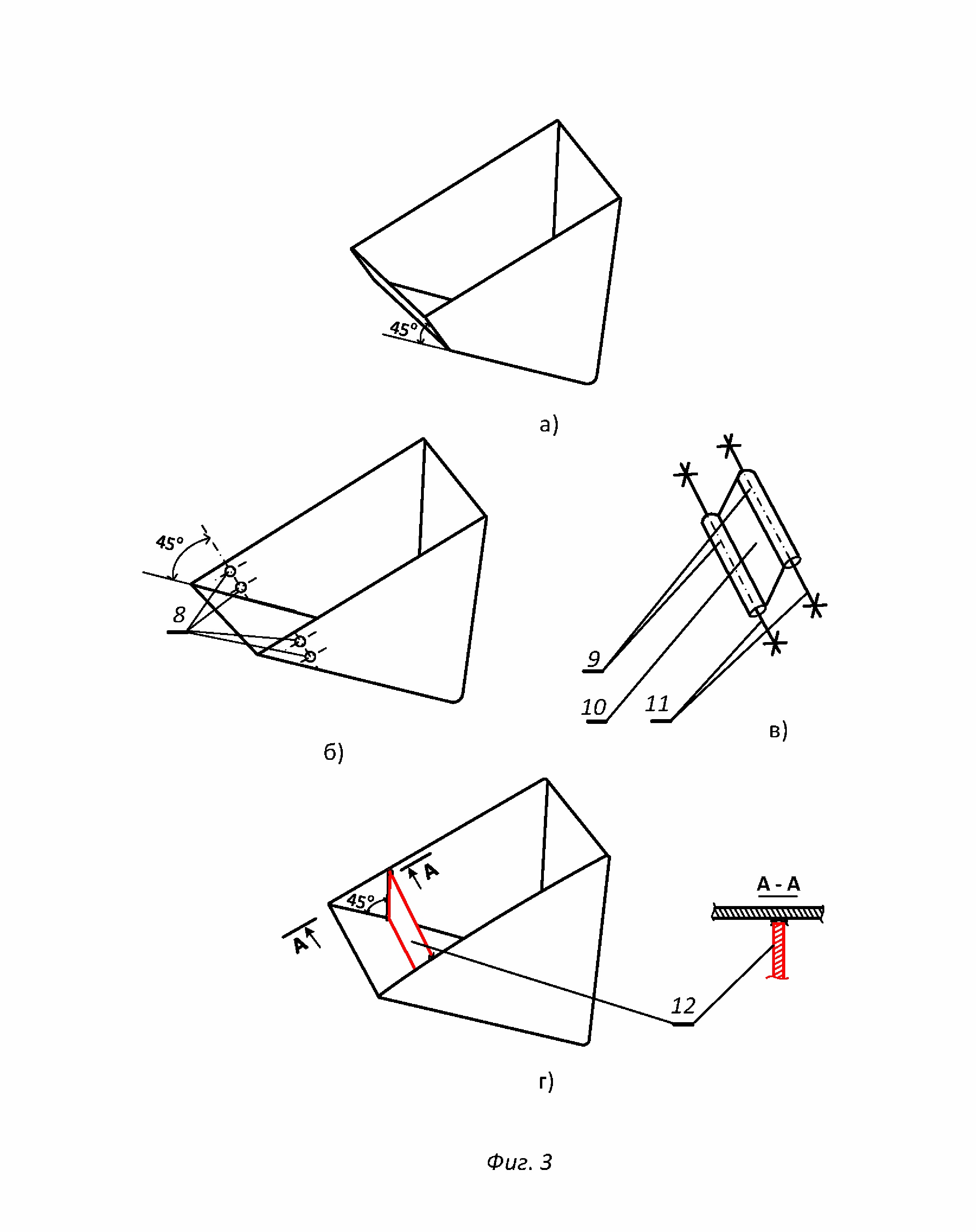 Третий вариант решения вопроса. Или еще предлагается к внутренним сторонам правого и левого бортов контейнера приварить (фиг.3, вид г) по одному направляющему желобу каждый длиной 50…60 мм, которые расположить под углом ~ 45° к плоскости внешней стенки и которые предназначены для опускания по ним перед началом АСР легкосъемной стальной полосы - 12 шириной 50…60 мм и ее фиксацией.