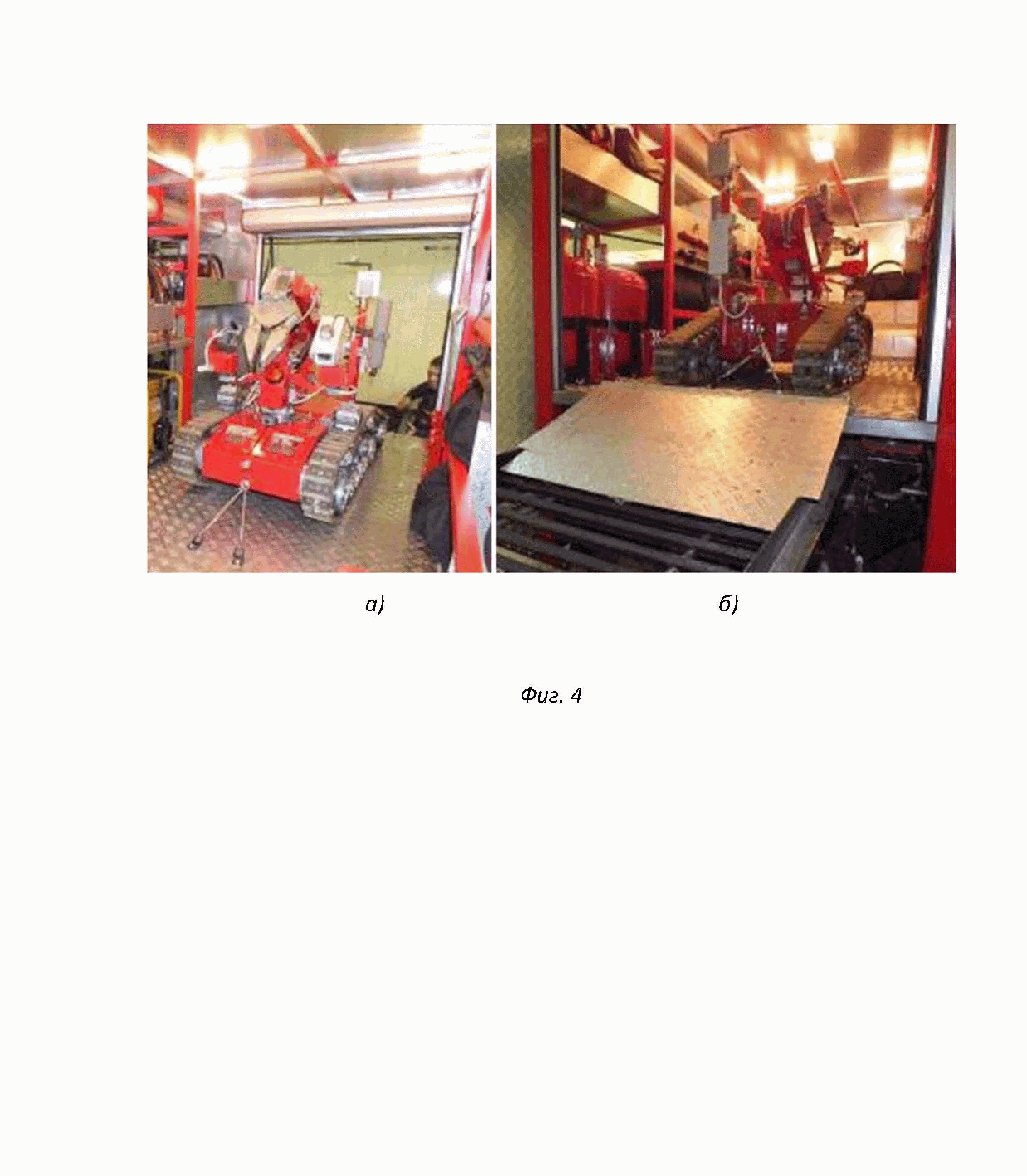 При следовании оперативной спецтехники «Мобильный робот…» в составе МРК-РП размещается в фургоне автомобиля быстрого реагирования АБР-РОБОТ - 2 (см. фиг.1) [см. Комплекс мобильный робототехнический. Руководство по эксплуатации. НТ598.00.00.000 РЭ. Утвержден НТ598.00.00.000РЭ - ЛУ. - М.: ВНИИПО МЧС России, - 85 с.] и стопорится посредством талрепов, съемных растяжек, передних и задних рым-болтов (фиг.4, вид а). Перед транспортировкой комплекса контейнер необходимо демонтировать. Контейнер является быстросъемным и также быстро может быть установлен, поскольку для ввинчивания/вывинчивания рым-болтов какого-либо инструмента не требуется.