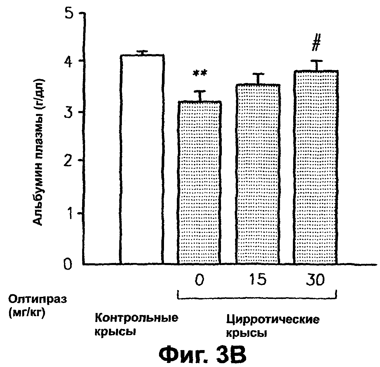 олтипраза и окрашивания трихромным красителем Мейссона. Фиг.3А является диаграммой в виде столбцов, показывающей уменьшение асцитов в цирротических крысах после введения олтипраза. Фиг.3B является диаграммой в виде столбцов, показывающей увеличение альбумина плазмы в цирротических крысах после введения олтипраза. Фиг.4А представляет диаграммы в виде