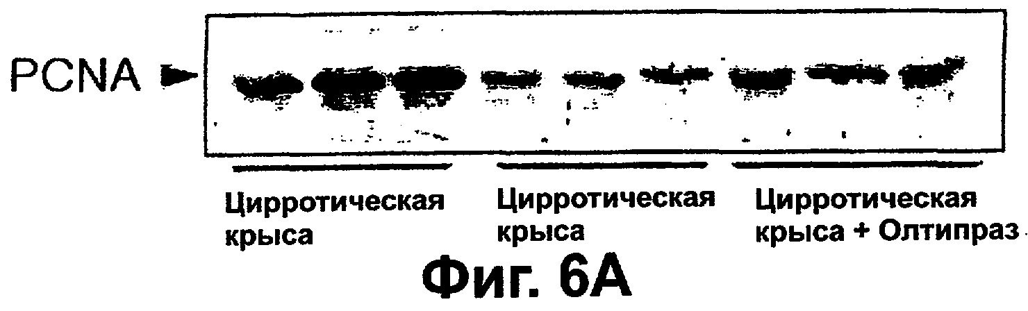 введением олтипраза в цирротических крыс. Фиг.5A представляет фотографии деления и регенерации клеток печени введением олтипраза в цирротических крыс после окрашивания PCNA (маркера