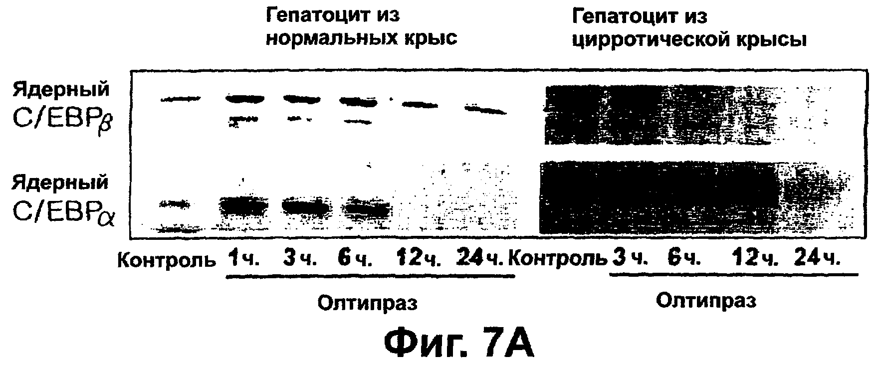 гель-электрофореза, показывающего постепенное увеличение количества С/ЕВР-β в ядерной фракции клеток после инкубирования гепатоцитов с олтипразом. Фиг.7B представляет