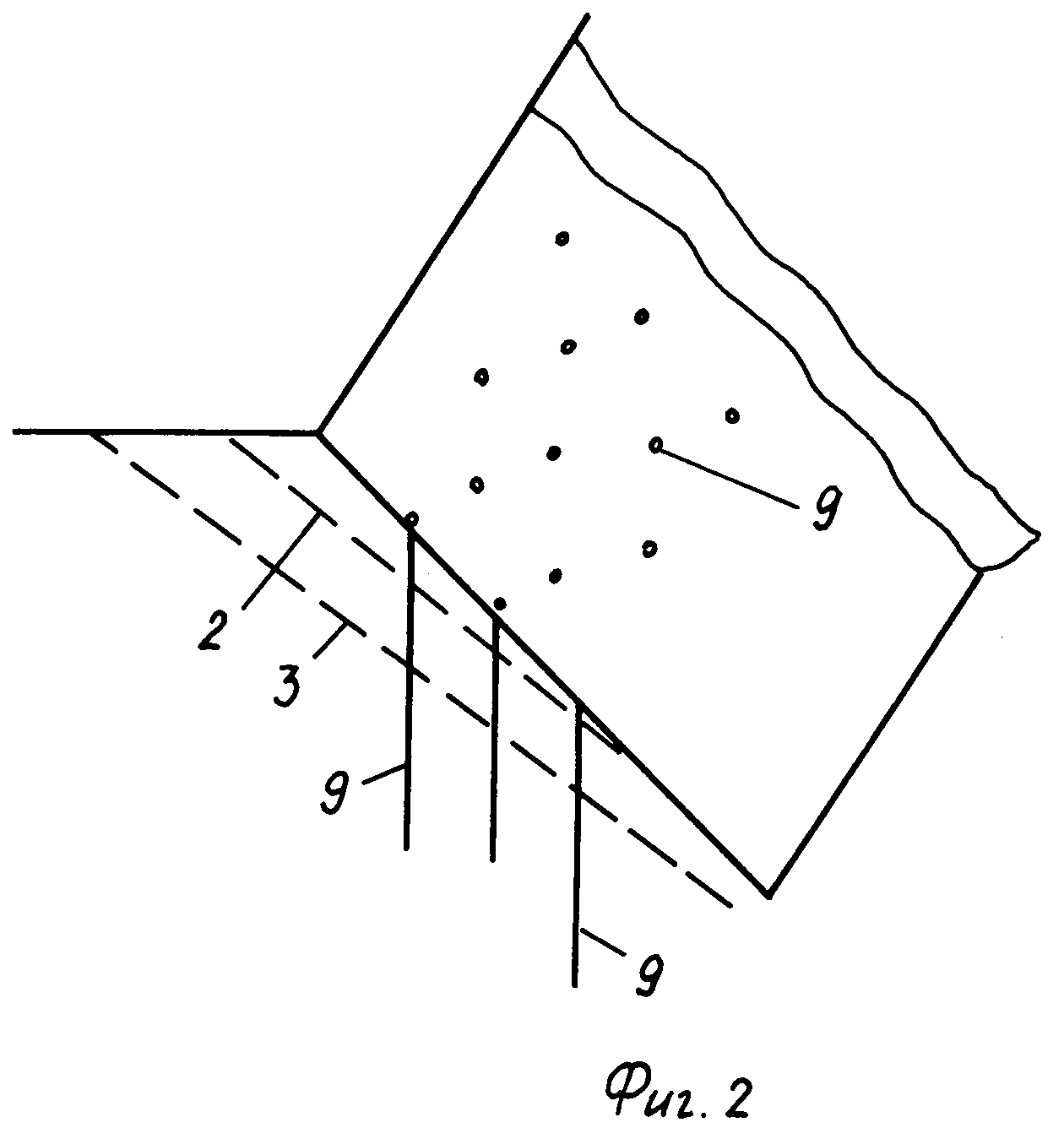 поверхностями скольжения 2, 3, укрепленный забивными элементами 9. На фиг.3 показан забивной элемент 9 с уширением 10 со скважиной, образованной после забивки элемента 9 в грунт и заполненной
