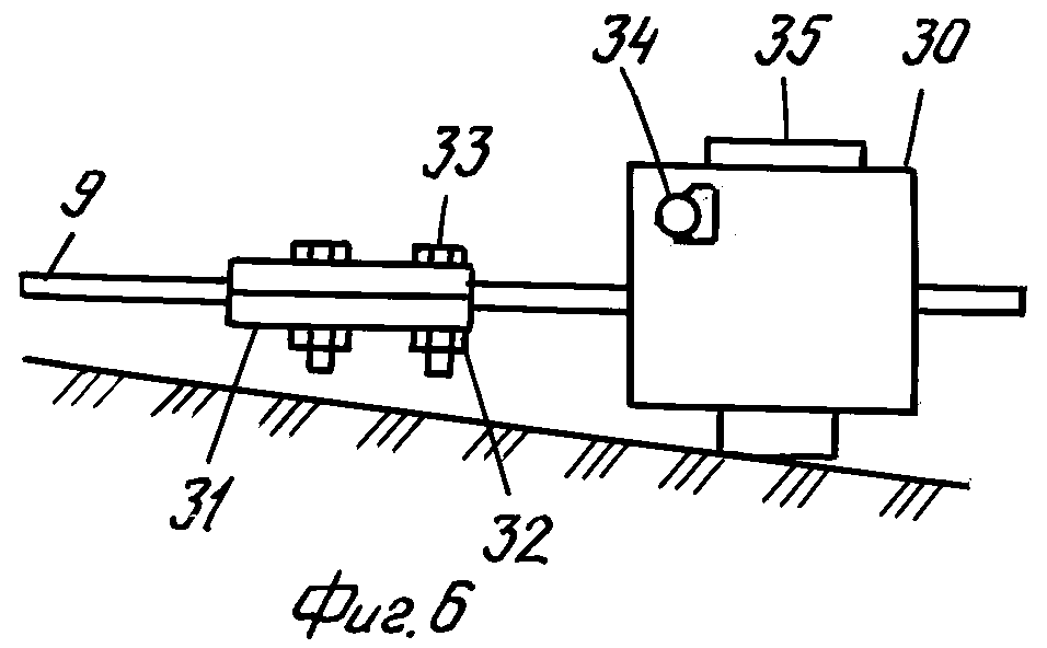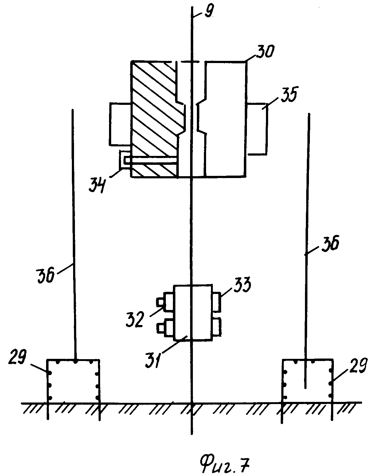 через сквозные отверстия в симметричных жестких пластинах, а также стопорный болт 34 и ручки 35. На фиг.7 показано оборудование для забивки элементов 9 в рабочем положении, которое состоит из