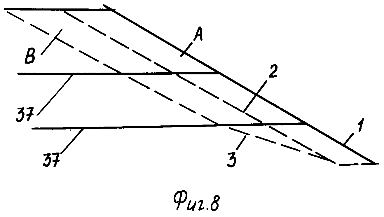 ручек П-образной формы 35, рабочих 36, стоящих на платформе Г-образной формы 29. На фиг.8 представлен откос 1, полученный в процессе возведения насыпи, где зона А и поверхность