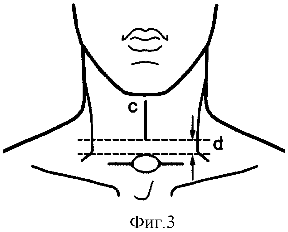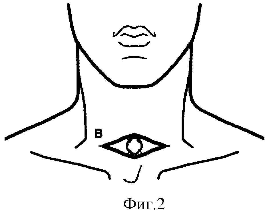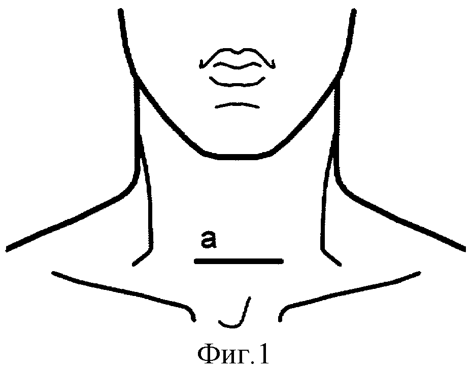 производится под местной анестезией горизонтальный разрез кожи и подкожной клетчатки для доступа к трахее (см. фиг.1 «а» - горизонтальный разрез кожи и подкожной клетчатки). Далее процесс обнажения и
