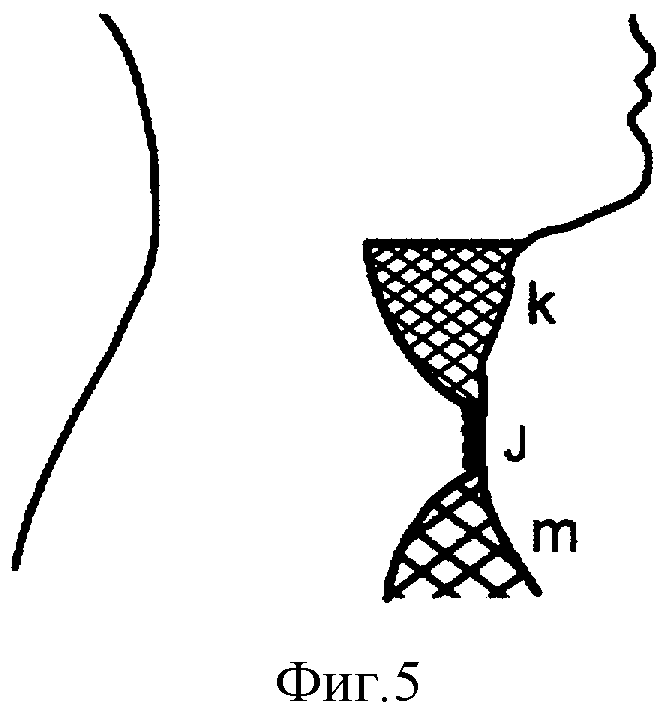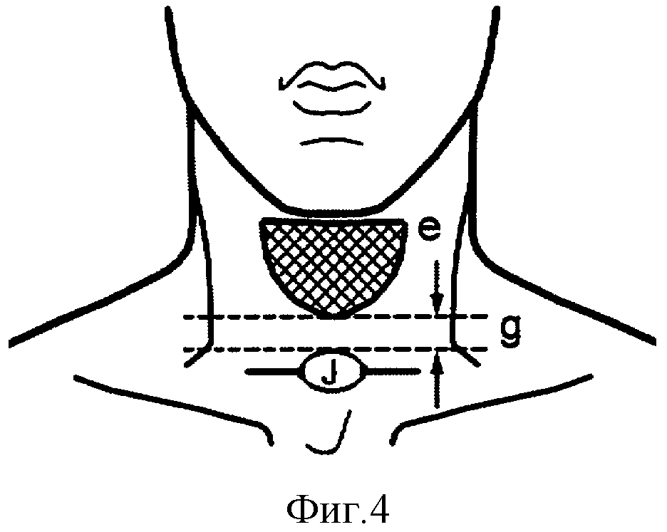 отверстие - трахеостому (см. фиг.4 «е» - формированная фарингостома, «д» - перешеек, «j» - трахеостома). Отсепарированный от трахеи кожно-жировой мостик аккуратно укладывают и подшивают