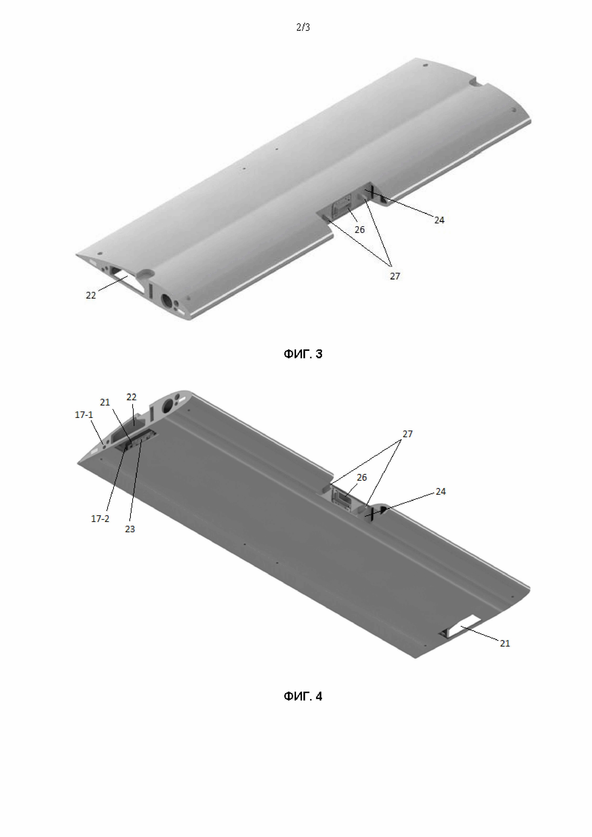 Область техники, к которой относится полезная модель Полезная модель относится к летательным аппаратам, в частности к конструкции разборного беспилотного летательного аппарата. Уровень техники Беспилотные летательные аппараты (БПЛА, UAV) постепенно становятся частью повседневной жизни - они выполняют доставку грузов, различные исследования, анализ окружающего пространства, мониторинг территорий, контроль объектов, фото- и видеосъемку, используются в спасательных операциях и находят множество других применений. Поскольку в типовом сценарии применения БПЛА не работает круглосуточно над одной и той же ограниченной территорией, а должен выполнять задачи на разных территориях и в разное время, важное значение приобретают вопросы быстрой и удобной транспортировки не находящегося в работе БПЛА от одной точки к другой точке и быстрой подготовки БПЛА к эксплуатации. Кроме того, БПЛА самолетного типа является довольно громоздким и требует либо наличия специально подготовленного транспорта, либо выполнения в разборном виде. Авторы настоящего документа предлагают ряд решений, которые позволяют повысить эффективность использования разборного БПЛА. Сущность полезной модели Предложен центроплан крыла беспилотного летательного аппарата, содержащий: лонжерон, выполненный в виде продольного силового элемента коробчатого типа; нервюры, прикрепленные к лонжерону и имеющие форму аэродинамического профиля крыла; заднюю стенку, прикрепленную к нервюрам и выполненную в виде продольного элемента коробчатого типа; обшивку, прикрепленную к лонжерону, нервюрам и задней стенке; и переднюю стенку, прикрепленную к двум центральным нервюрам в передней части центроплана до лонжерона, причем пространство, образованное в передней части центроплана между передней стенкой и центральными нервюрами, к которым она прикреплена, свободно от обшивки, причем к передней стенке прикреплен разъем электросистемы, предназначенный для соединения с ответным разъемом электросистемы, расположенным на фюзеляже, причем передняя стенка содержит крепежные элементы для соединения с ответными крепежными элементами на фюзеляже методом вставки, причем крепежные элементы на передней стенке представляют собой клиновидные элементы, выступающие из передней стенки на величину, превышающую величину, на которую из передней стенки выступает разъем электросистемы. В одном из вариантов осуществления клиновидный элемент имеет вблизи передней стенки постоянное поперечное сечение, приблизительно равное поперечному сечению ответного крепежного элемента на фюзеляже, и клиновидное сужение на конце, причем длина, вдоль которой клиновидный элемент имеет постоянное поперечное сечение, больше величины, на которую из передней стенки выступает разъем электросистемы. Технический результат Настоящая полезная модель позволяет упростить и ускорить процессы сборки/разборки БПЛА, а также увеличить надежность и безопасность разборного БПЛА. Эти и другие преимущества настоящей полезной модели станут понятны при прочтении нижеследующего подробного описания со ссылкой на сопроводительные чертежи. Краткое описание чертежей На Фиг. 1 показан БПЛА в сборе. На Фиг. 2 показана конструкция центроплана. На Фиг. 3-5 показаны виды в разных проекциях другого варианта осуществлен