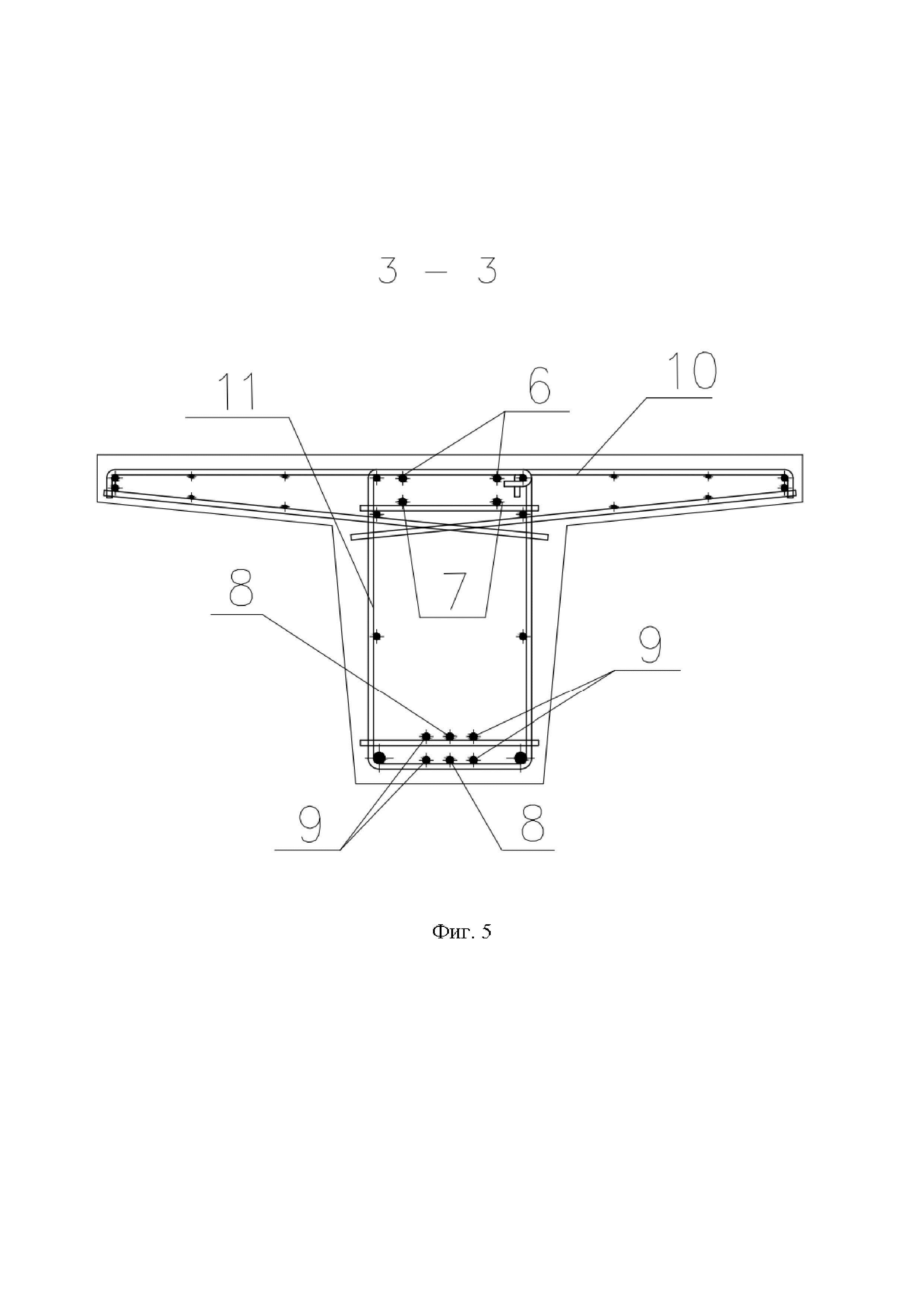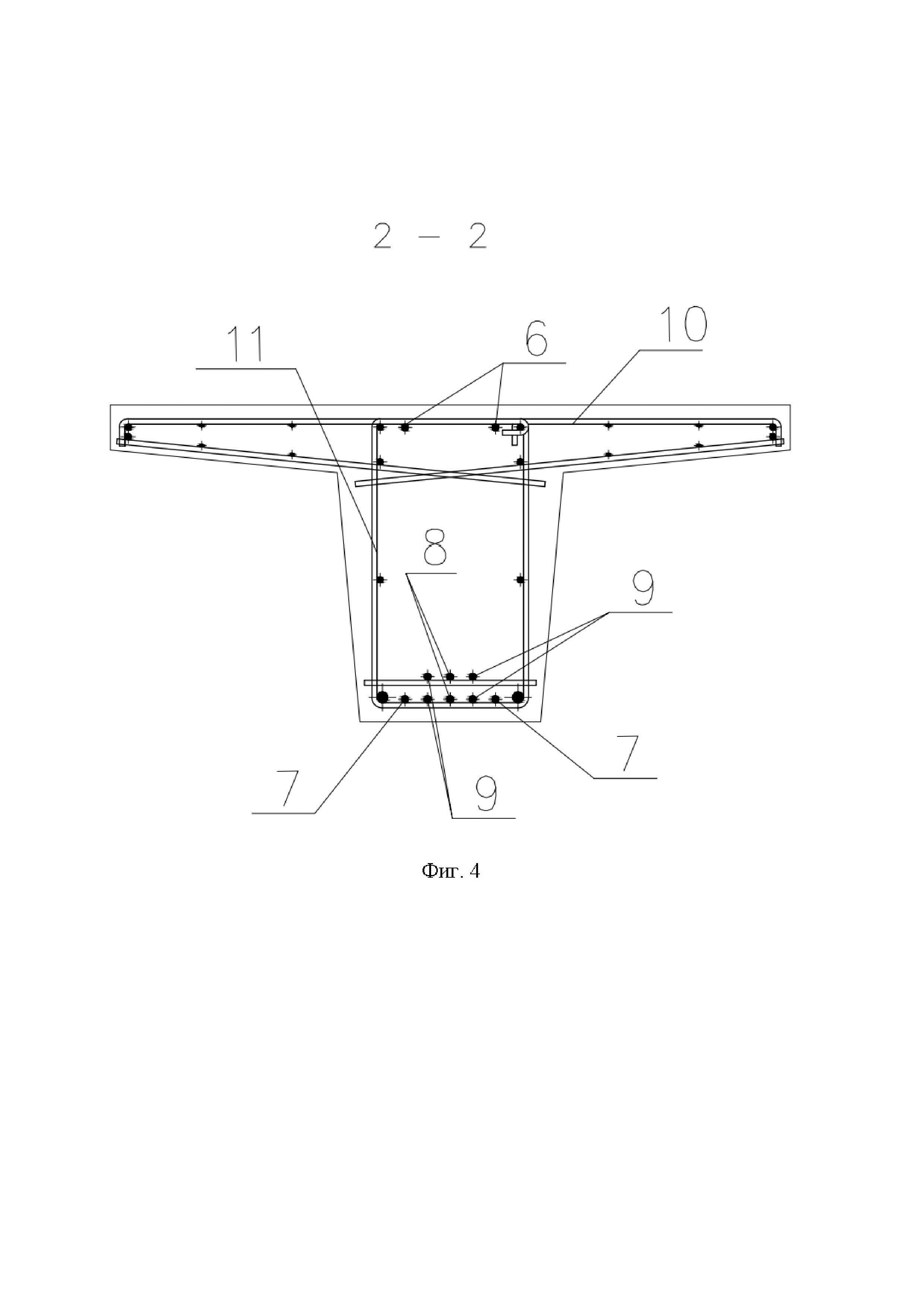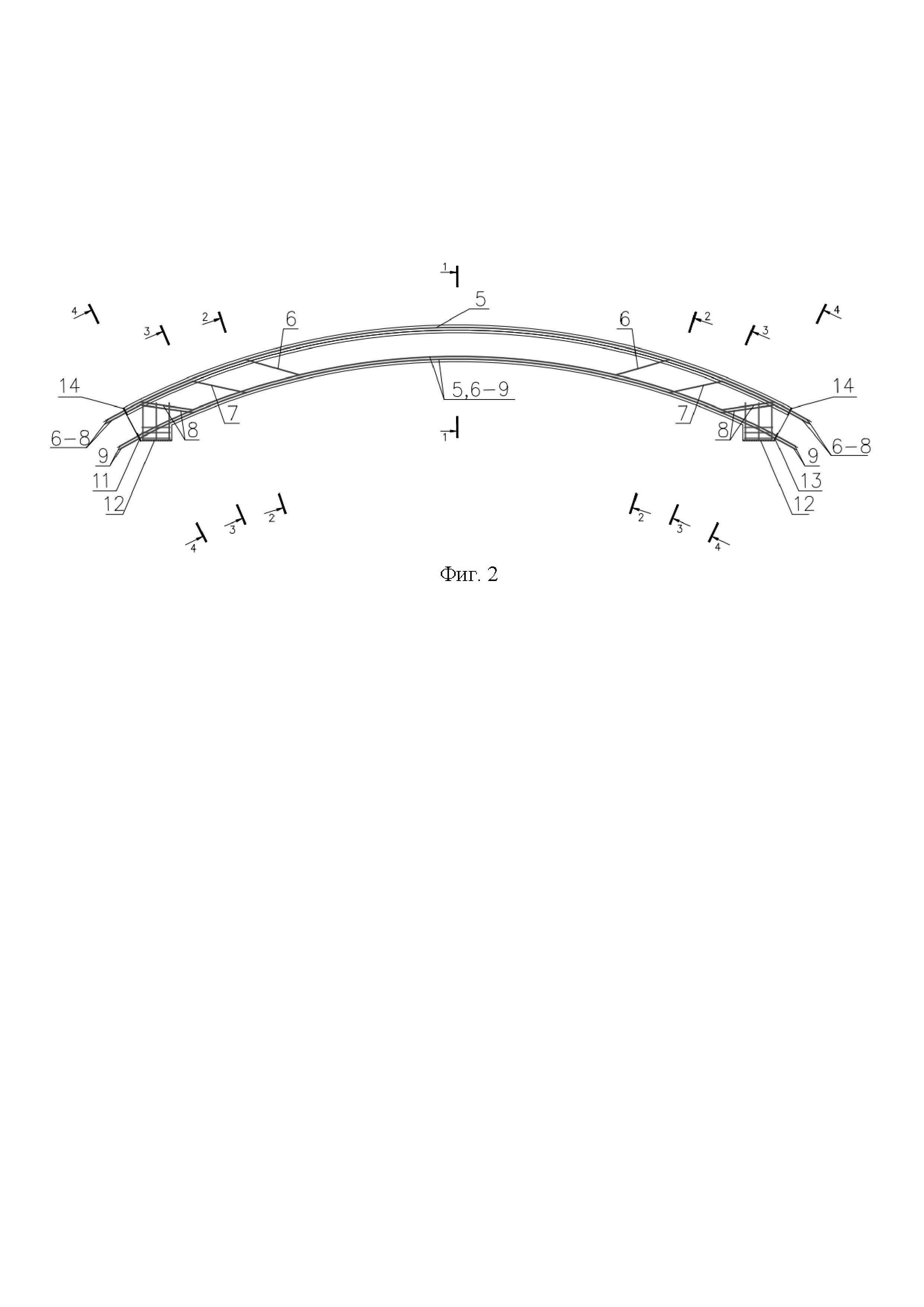 Область техники, к которой относится полезная модель Полезная модель относится к строительству, а именно к арочным железобетонным конструкциям с преднапряжением без сцепления с бетоном, и может быть использована для переходов через небольшие водные преграды в виде ручьев и небольших речек. Уровень техники Первый предварительно напряженный бетонный мост был построен в 1938 году, согласно планам Фрейсина в Oelde на автостраду из Дортмунда в Ганновер. Особенностью системы предварительного напряжения без сцепления с бетоном является отсутствие процесса инъектирования, так как в качестве напрягаемых арматурных элементов, работающих без сцепления с бетоном, применяются стальные проволочные канаты в оболочке («моностренд») с двойной антикоррозионной защитой в виде пластичной смазки и пластмассовой трубки. Смазка способствует уменьшению сил трения при натяжении каната, а пластмассовая трубка позволяет производить натяжение армоканата после бетонирования и набора бетоном проектной прочности. Канат в оболочке не соприкасается с бетоном в течении всего срока эксплуатации. В строительстве чаще всего используют арки с затяжкой на опорах и арки с затяжкой выше опор, арки переменного сечения. Чаще используется предварительное напряжение без сцепления с бетоном, выполняемое непосредственно перед монтажом конструкции, так как арки собираются или заливаются из монолита на строительной площадке. Самым сложным при работе с арочными конструкциями является размещение предварительно напряженной арматуры по дуге, так как канатную арматуру необходимо разместить строго по эпюре момента в продольном направлении. По статической схеме, арочные мосты разделяются на: 1. Распорные арочные мосты; 2. Арочные системы с затяжками (безраспорные). Известен мост однопролетный металлический балочный (Мучной мост в Санкт-Петербурге). Пролетное строение состоит из двух стальных двутавровых балок высотой в замках 0,8 м. Расстояния в осях главных балок - 2,26 м. Верхние и нижние пояса балок очерчены по циркульным кривым разных радиусов, что дает увеличение высоты балок у опор до 1,26 м. Монтажные стыки главных балок сварные и на высокопрочных болтах. Расчетный пролет - 20,2 м. Устои монолитные железобетонные на свайном основании из буроинъекционных свай. Длина моста (по задним граням устоев) составляет 22,0 м, ширина - 2,3 м. Мост предназначен для пешеходного движения и прокладки труб теплотрассы. Прохожая часть представляет собой съемные металлические панели, состоящие из металлических листов толщиной 12 мм, подкрепленных продольными и поперечными ребрами жесткости. Покрытие прохожей части моста - тонкослойное полимерное. Перильное ограждение металлическое сварное, простого рисунка. По фасадам главных балок устроен металлический карниз. Недостатками известного решения является то, что он металлический и в процессе его эксплуатации необходим уход поверхностного слоя металла с необходимостью покраски и т.д. Известен мост однопролетный арочный со сплошным железобетонным бесшарнирным сводом (Эрмитажный мост в Санкт-Петербурге). Устои моста из бутовой кладки на свайном основании, облицованы гранитом. Толщина железобетонного свода в замке - 25 см, у пят - 45 см; размеры свода эллиптической формы в свету составляют 9,73 м, при стреле подъема его внутреннего очерта