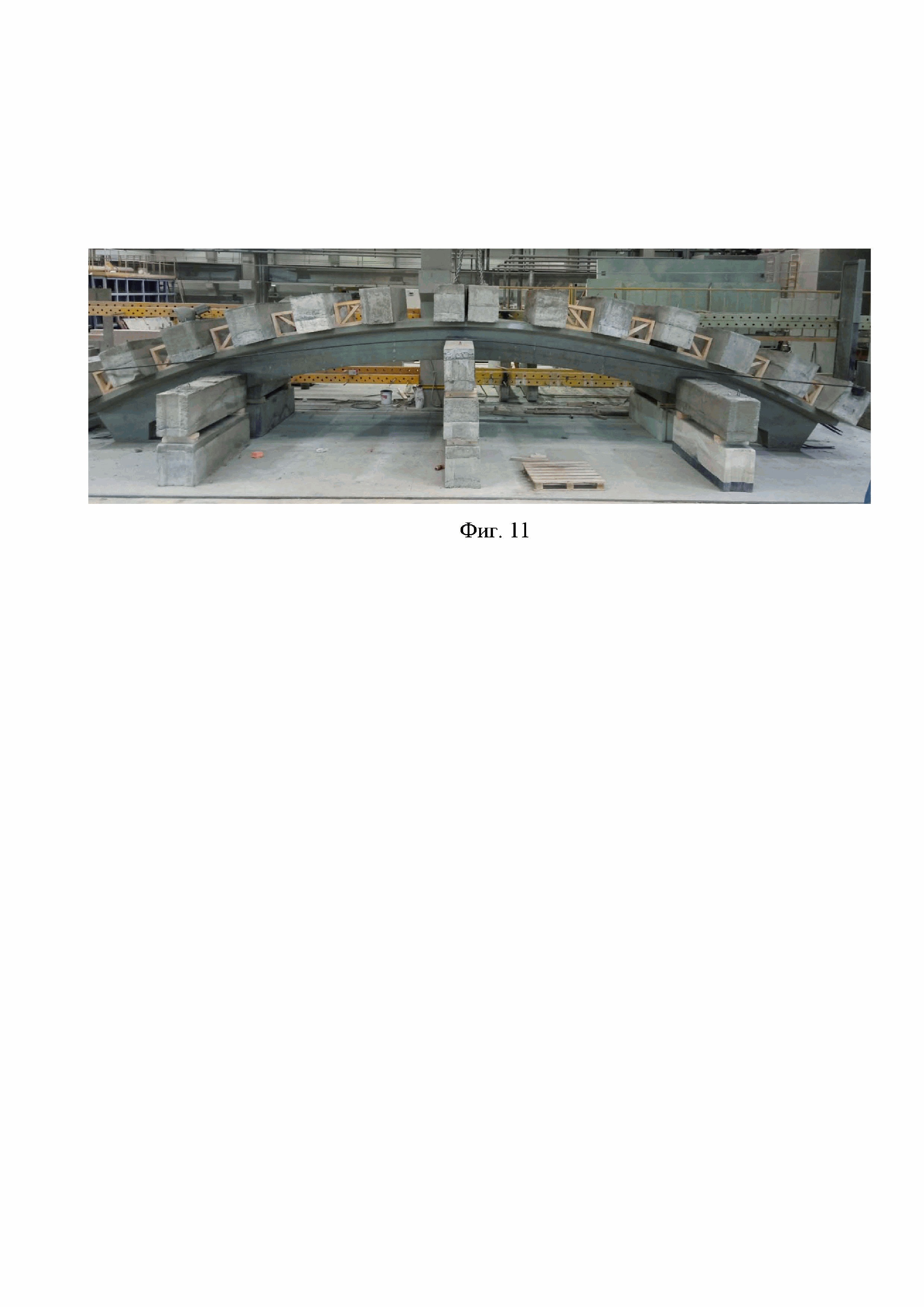 Полезная модель относится к строительству, а именно к арочным железобетонным конструкциям с преднапряжением без сцепления с бетоном, и может быть использована для переходов через небольшие водные преграды в виде ручьев и небольших речек. Арочная железобетонная конструкция с предварительным напряжением без сцепления с бетоном, содержащая основное тело, выполненное из монолитного бетона, имеющее тавровую симметричную форму сечения, рабочую арматуру, выполненную из отдельных радиусных гнутых стержней периодического профиля, стальные арматурные канаты - моностренды, покрытые непрерывной полимерной оболочкой с прослойкой из антикоррозионного состава, которые используют в качестве верхнего и нижнего армирования, и расположенные в продольном направлении, вспомогательную арматуру, выполненную из отдельных гнутых стержней периодического профиля, вспомогательную арматуру, выполненную из хомутов периодического профиля, опорные закладные детали, установленные в основании формы опалубки, верхние и нижние торцевые закладные детали, расположенные на стальных арматурных канатах - монострендах, причем цанги расположены на торцах арочной железобетонной конструкции, упираясь в закладные детали. Технический результат при использовании заявленного решения заключается в повышении долговечности арочной железобетонной конструкции с предварительным напряжением без сцепления с бетоном за счет возможности донатяжения канатной арматуры при потере при эксплуатации части прочности от релаксации, а также объединения подобных изделий в один элемент для использования как для пешеходной зоны, так и для проезда автомобильного транспорта. 7 з.п. ф-лы, 11 ил.