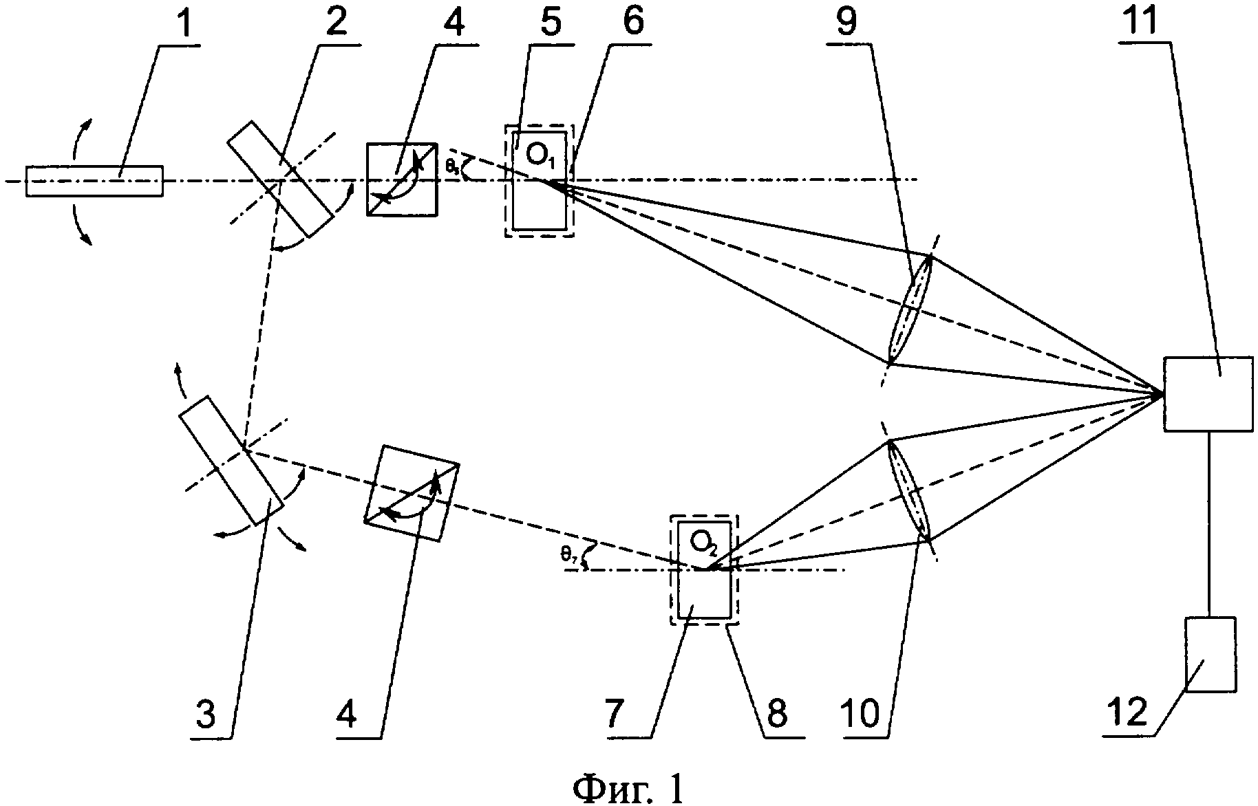 объекта 7, при этом для изменения названного угла зеркало 3 перемещают по дуге и/или вращают вокруг оси нормальной к плоскости рисунка (фиг.1). Достижение приведенного выше равенства