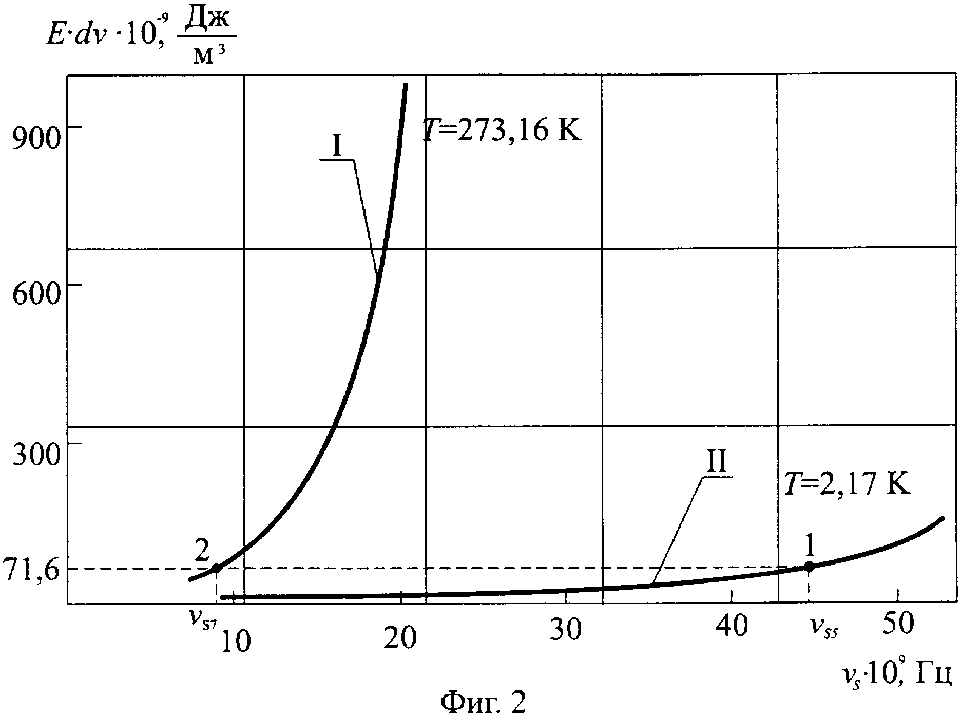 =f(νs), представленной кривой I на фиг.2 При выполненных двух вышеупомянутых условий устанавливают равенство плотностей энергии тепловых фононов в объектах 5 и 7 Es5·dνs5=Es7·dνs7. где Es5 и Es7, Дж - кинетическая энергия фононов в объектах 5 и 7; dνs5 и dνs7, Гц - полоса частот фононов в объектах 5 и 7, для чего варьируют частоту νs7 изменением угла облучения θ7