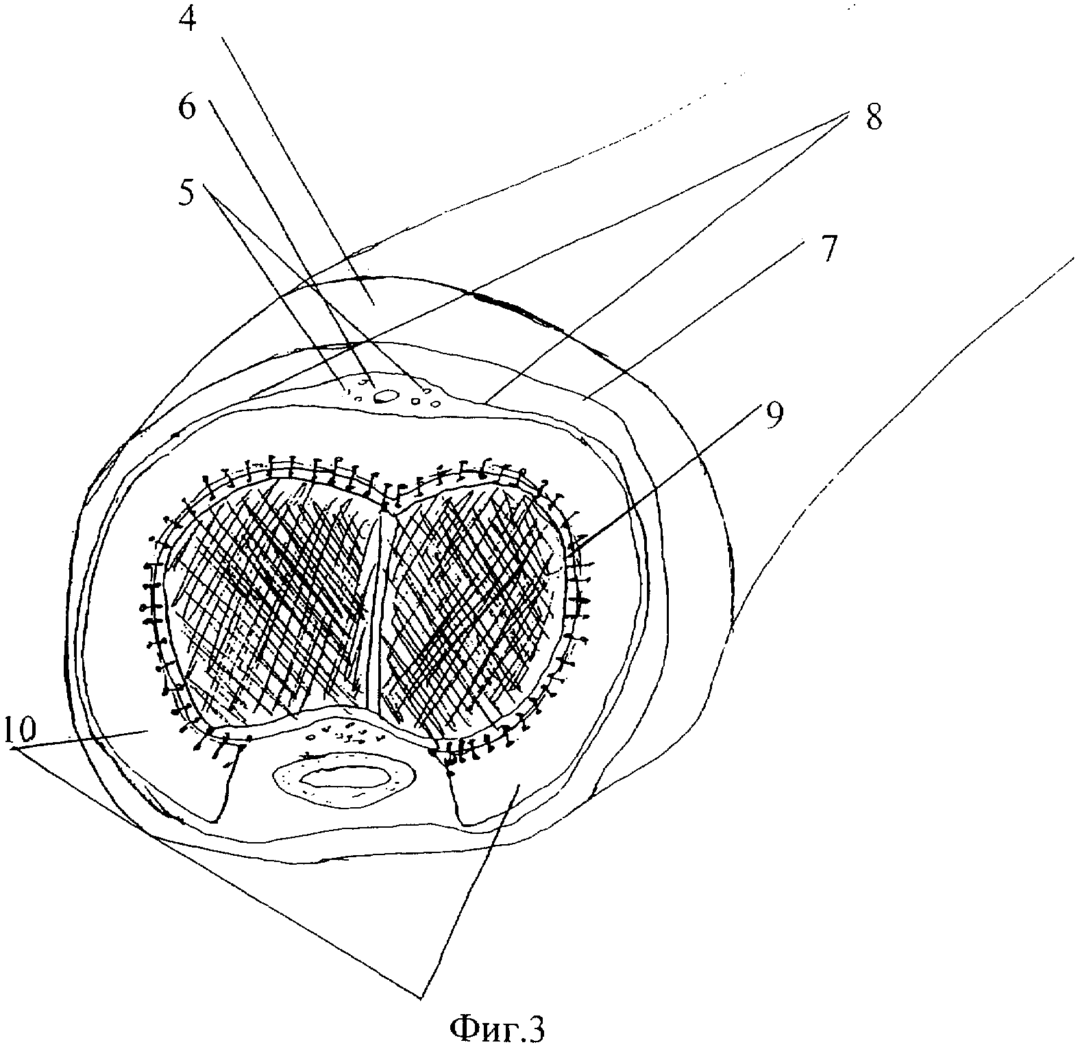 на всем протяжении полоски трансплантата по его периметру (фиг.3 и фиг.4). После подшивания полоска трансплантата выглядит в виде незамкнутого кольца в проекции уретры. Толщина создаваемого кольца из