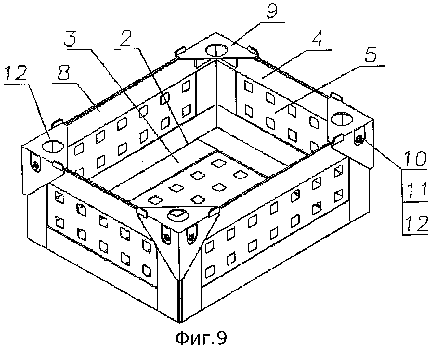 стенок 4 при помощи угловых замков 9. При этом фиксирующие выступы 10 со скосами 11 замков 9 за счет упругих свойств материала защелкиваются в фиксирующих отверстиях 12 смежных боковых стенок 4. Затем