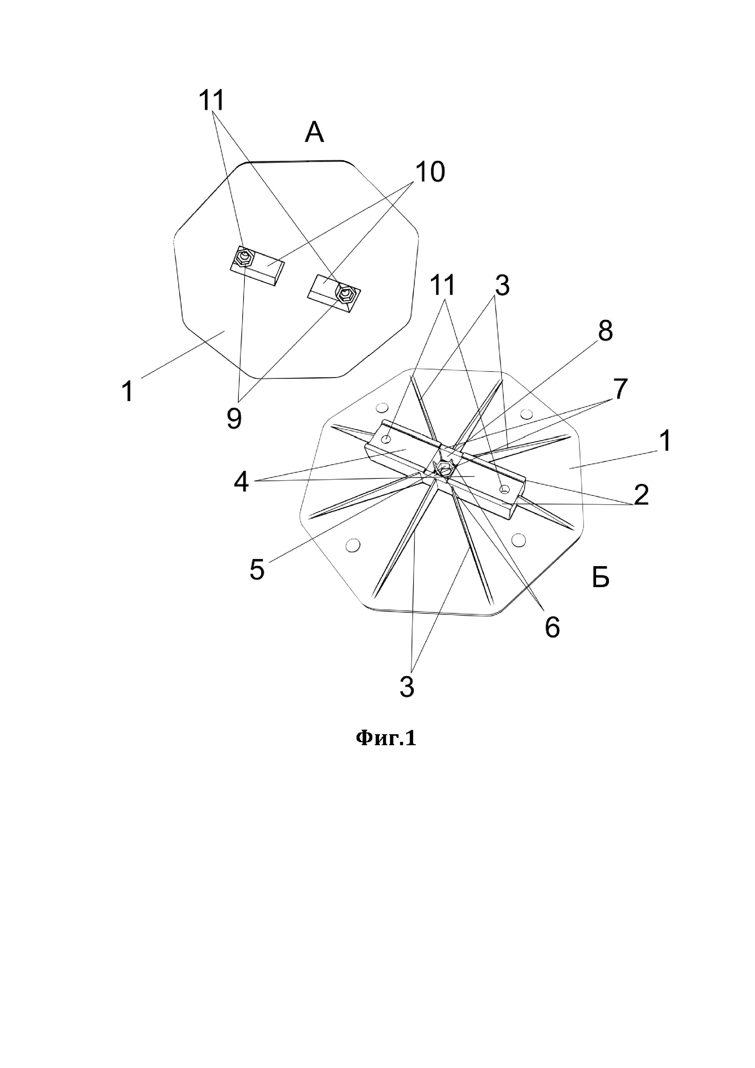 Для уменьшения веса конструкции и снижения расхода материала полости 9 в форме замкнутой фигуры с нижней стороны корпуса (см. Фиг.1(А)) могут быть сформированы внутри выступов 2 на основании дополнительных углублений 10, выполненных в зоне отверстий 11.