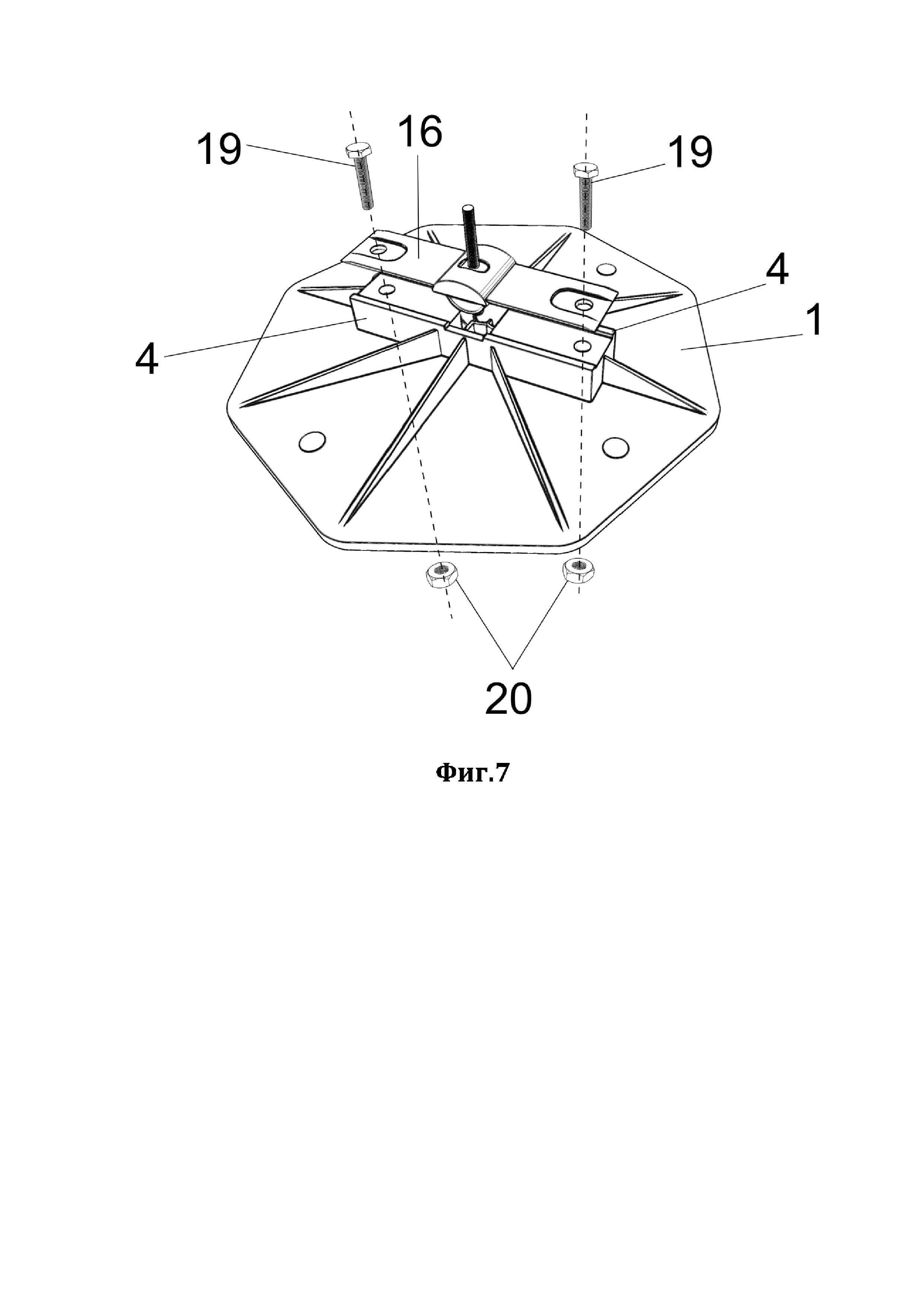 Так, для фиксации требуемого угла наклона шарнирного узла от 0 до 15 градусов (см. Фиг.9), накладка 16 является не только удерживающим элементом, но и прижимает (за счет болтовых соединений) и удерживает шарнир в необходимом положении относительно точки опоры в корпусе основания 1 до момента полной фиксации всех деталей.