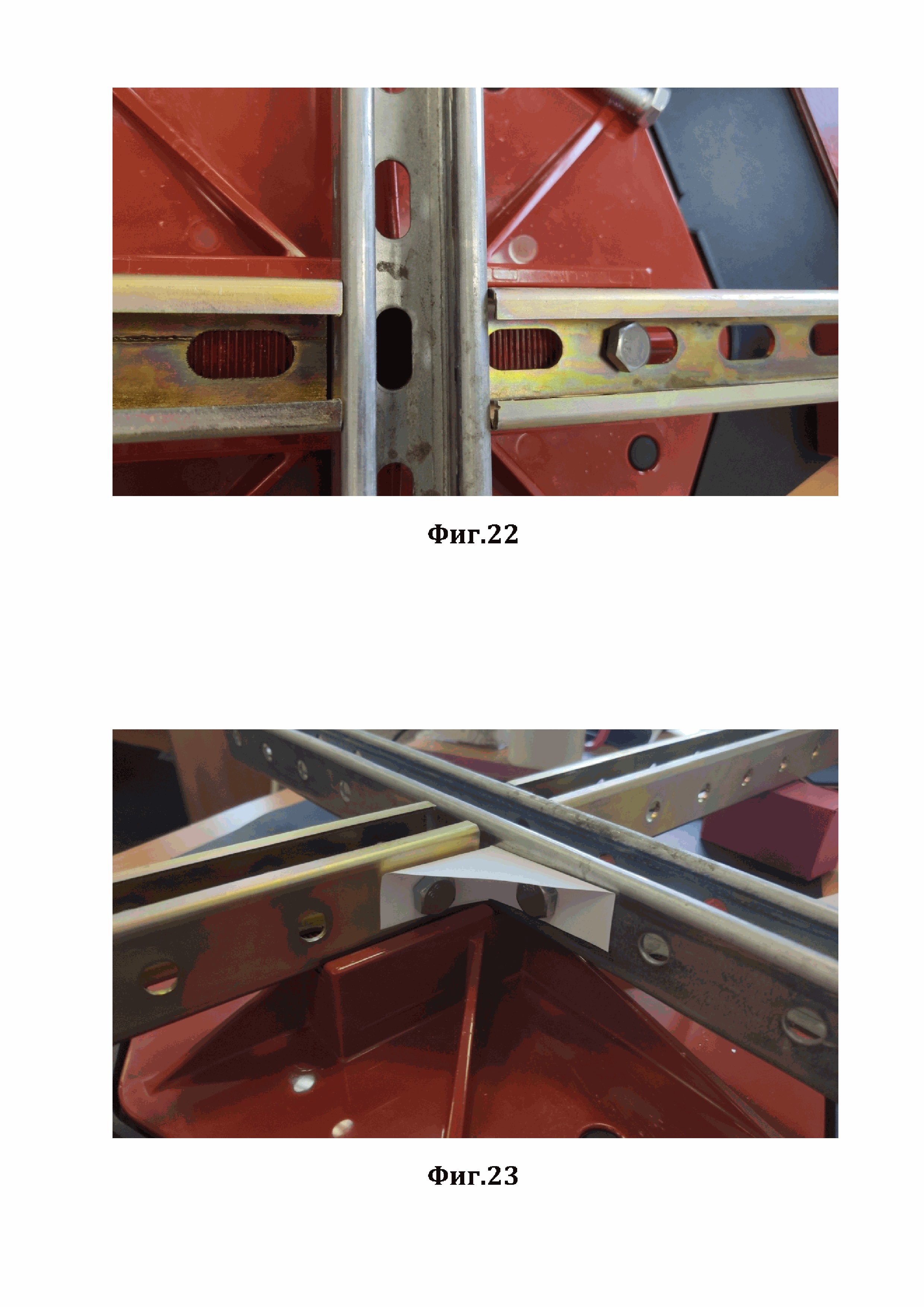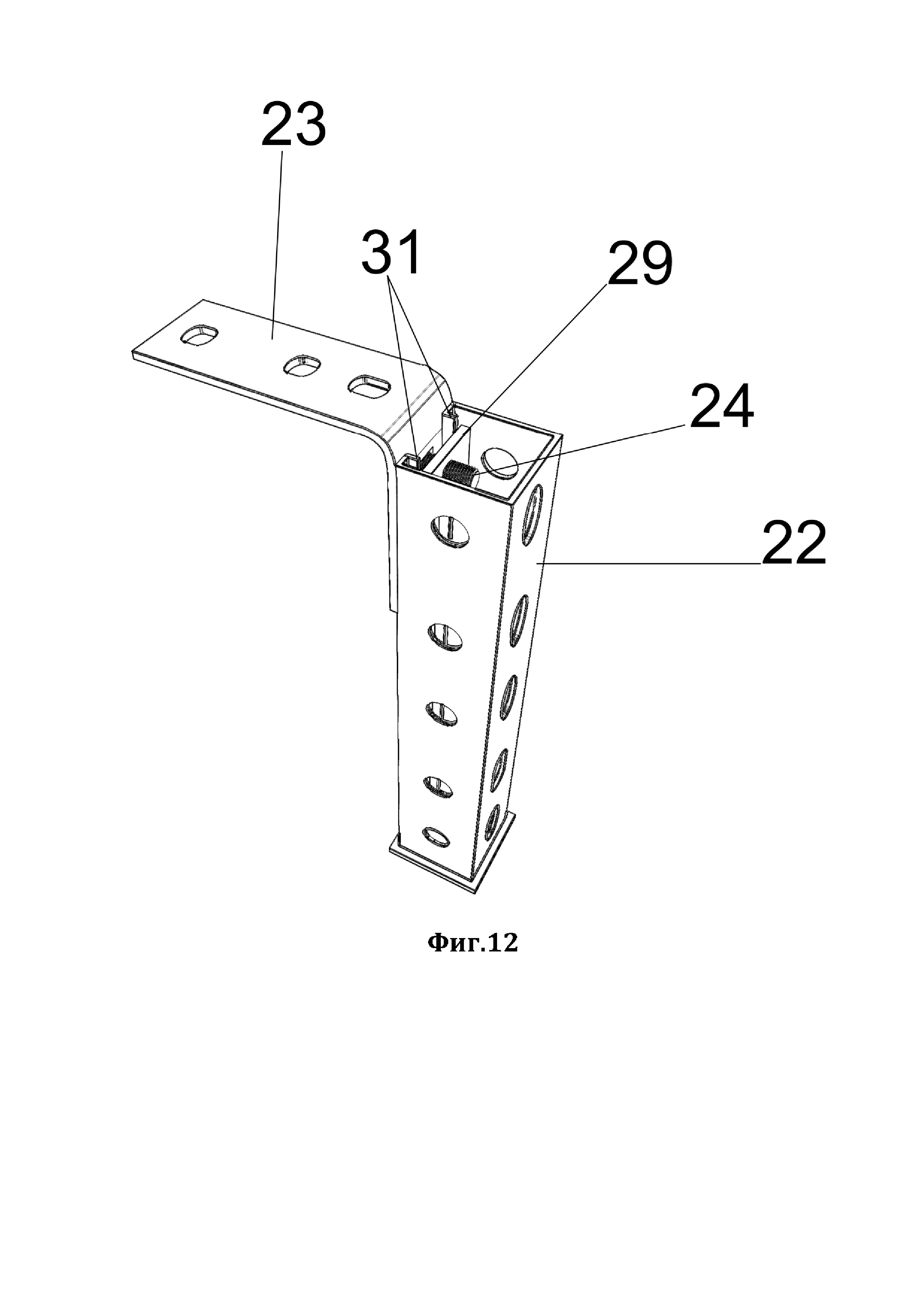 Угловой кронштейн (см. Фиг.11 - Фиг.12) представляет собой уголок 23, который фиксируется к С-образному профилю для подвижного смещения методом прижима. Прижим обеспечивается болтом 24, шайбой 30 и гайкой в форме упорной пластины 29, где края последней располагают в проеме С-образного профиля 22, упирая на его торцы 31 с внутренней стороны, а уголок 23 располагают с внешней стороны проема С-образного профиля. При необходимости смещения уголка болт 24 ослабляют и сдвигают уголок продольно по проему С-образного профиля. Так осуществляют грубую регулировку по высоте.
