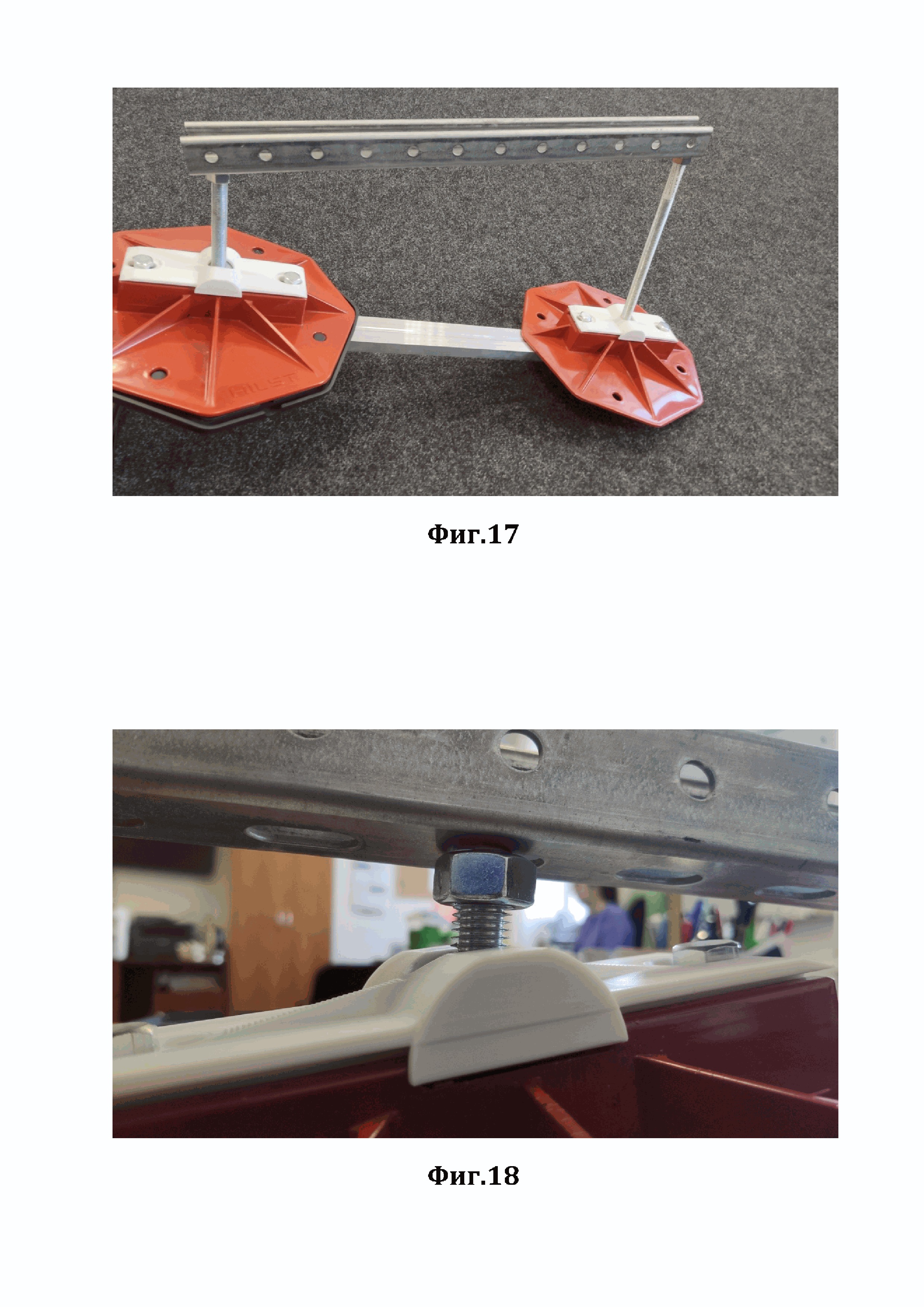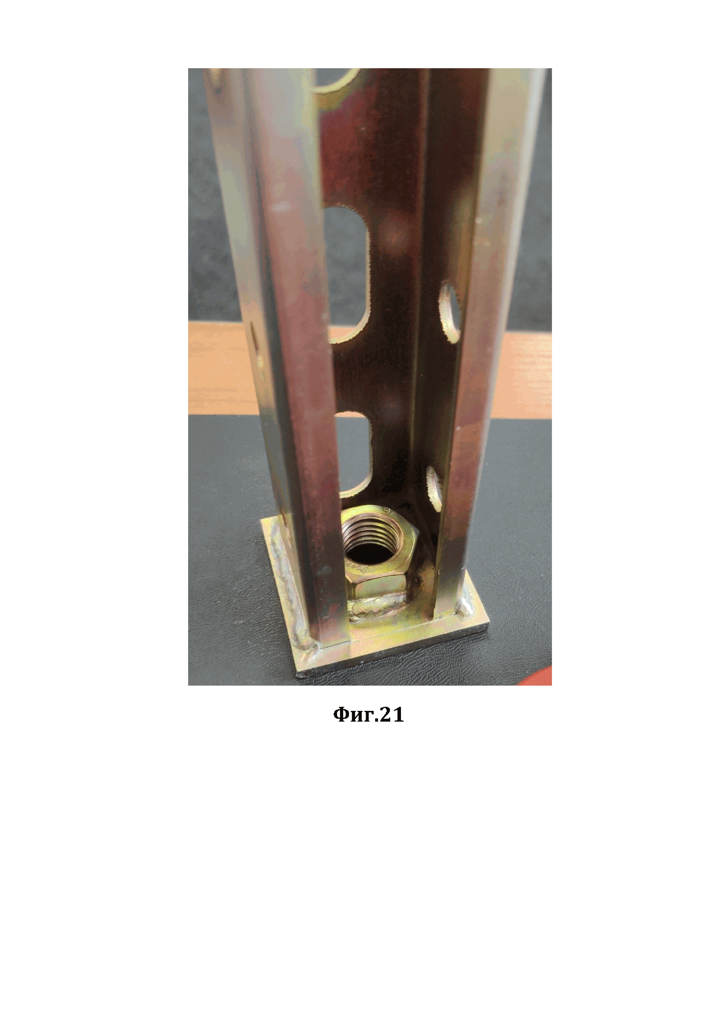 При необходимости, с помощью накрученной поверх выступающего конца стержня 15 гайки можно удерживать профилированную секцию на нужной высоте от основания (см. Фиг.18, Фиг.19) и при этом наклонять профилированную секцию под разным углом.