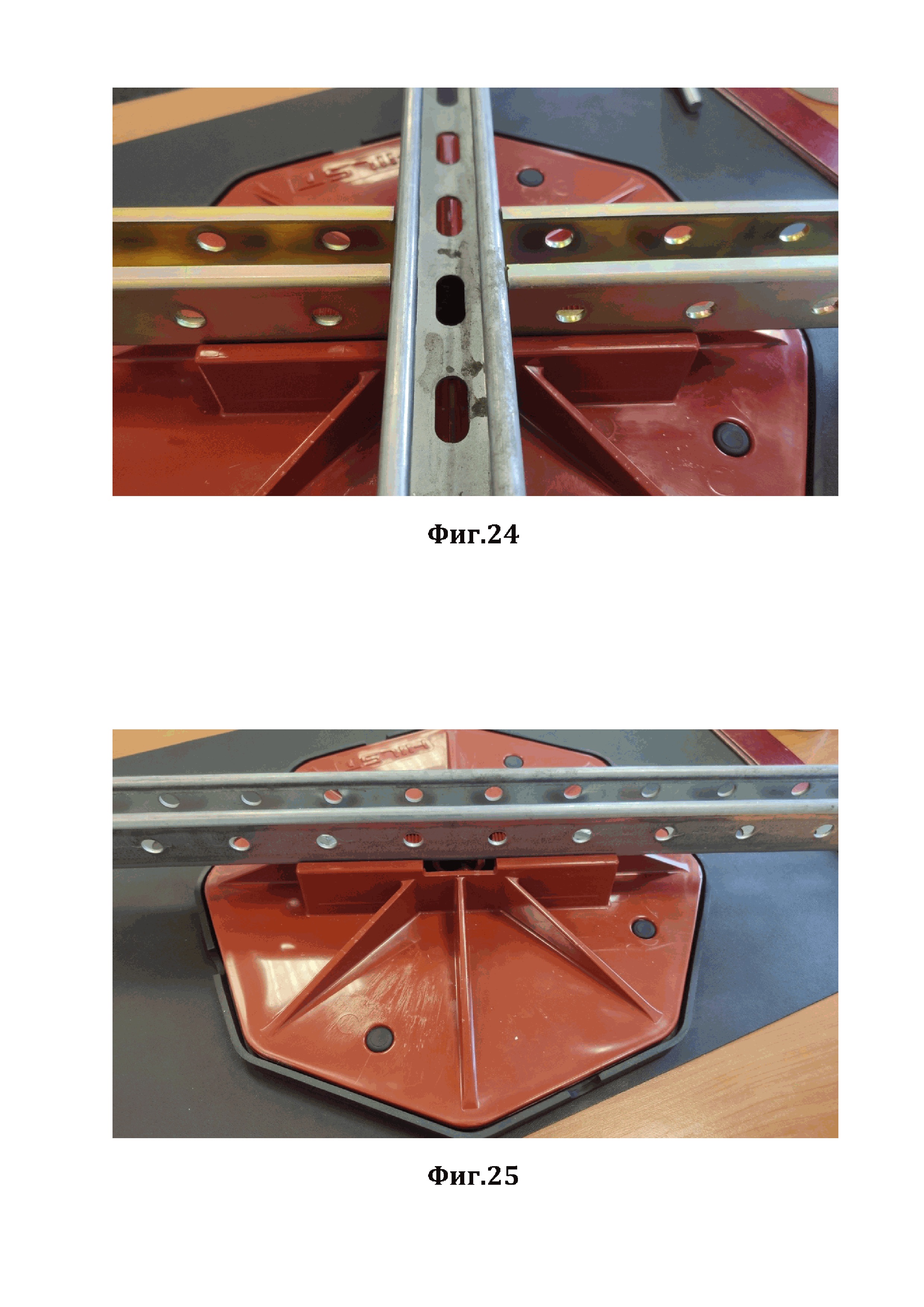 При этом, возможно выполнить монтаж подсистемы без использования дополнительных элементов. Более того, профилированные секции жестко фиксируются к опоре с помощью двух болтовых соединений (см. Фиг.26), что создает надежную монолитную систему, которую можно применять на плоских основаниях или с малыми уклонами без требования выравнивания подсистемы по горизонтали, на высоко нагруженных системах, при больших ветровых нагрузках (высокого риска бокового смещения), для создания фальшполов, а также для создания минимального пространства между основанием и подсистемой.
