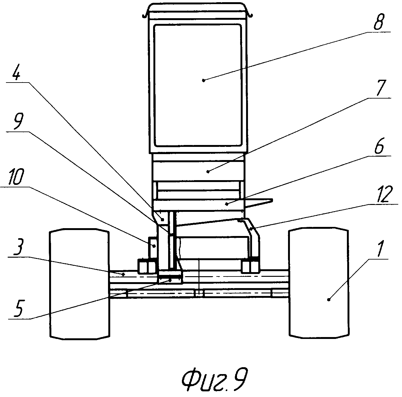 Изобретение относится к сельскохозяйственному машиностроению, а именно к конструкции элементов и приспособлений самоходного шасси на гусеничном ходу, являющегося высвобождаемым мобильным энергомодулем, облегчающих его адаптирование к задаче монтажа большего количества сменных технологических модулей, то есть повышения его универсальности. Известны конструкции гусеничных самоходных шасси моноблочной структуры, представляющие собой гусеничную ходовую тележку, на поперечных трубах рамы которой с помощью поперечных Г-образных опор несъемно установлена несущая рама с кабиной и моторно-силовой установкой. При этом несущая рама, Г-образные опоры и рама гусеничной ходовой тележки представляют в изделии монолитную несущую конструкцию, обеспечивающую продольное левостороннее (КСГ-3,2А) [1] или правостороннее (КСГ-Ф-70) [2] расположение кабины с моторно-силовой установкой над соответствующим гусеничным движителем. Недостаток данной конструкции - самоходное шасси, как база самоходной специализированной сельскохозяйственной машины, не является универсальным и гибким. Наиболее близким к изобретению является гусеничное самоходное шасси, представляющее собой высвобождаемый мобильный энергомодуль, содержащий нижнюю часть - гусеничную ходовую тележку (ходовой модуль), верхнюю часть - несущую раму с постоянным оборудованием (энергомодуль) и переходное устройство, их объединяющее [3]. Переходное устройство представляет собой подрамник, закрепляемый на кронштейнах поперечных труб рамы гусеничной ходовой тележки, и установленную на нем раму-платформу на всю ширину гусеничной тележки. Рама-платформа служит общей основой для монтажа как верхней части самоходного шасси, так и сменных технологических модулей при формировании на его базе специализированных самоходных машин. Верхняя часть самоходного шасси представляет функциональный энергомодуль и содержит постоянное оборудование, расположенное на продольно вытянутой вдоль гусеничной ходовой тележки несущей раме: площадку управления с кабиной, имеющую двухсторонний выход, и моторно-силовую установку, обеспечивающую независимый привод ходовой и технологической частей. Причем приводы выполнены как автономные объемные гидроприводы, а органы управления работой гусеничной ходовой тележки связаны с соответствующими исполнительными механизмами гидравлически и механически посредством тросиков дистанционного управления двухстороннего действия. Это обеспечивает внешнюю гибкость [4] самоходному шасси, проявляющуюся в способности к перекомпоновке верхней части за счет перестановки несущей рамы с постоянным оборудованием по ширине, например, из левостороннего в правостороннее или центральное положения по отношению к продольной оси гусеничной ходовой тележки. А в каждом из этих положений возможно смещение вперед и назад. Недостаток данной конструкции - ограниченная универсальность, повышенная металлоемкость, предельный габарит по высоте формируемых на базе шасси специализированных машин, что связано с наличием общей рамы-платформы на всю ширину гусеничной тележки, конструктивно исключающей варианты более низкого расположения сменных технологических модулей, например непосредственно на кронштейнах поперечных труб рамы гусеничной ходовой тележки. Задачей, на реш