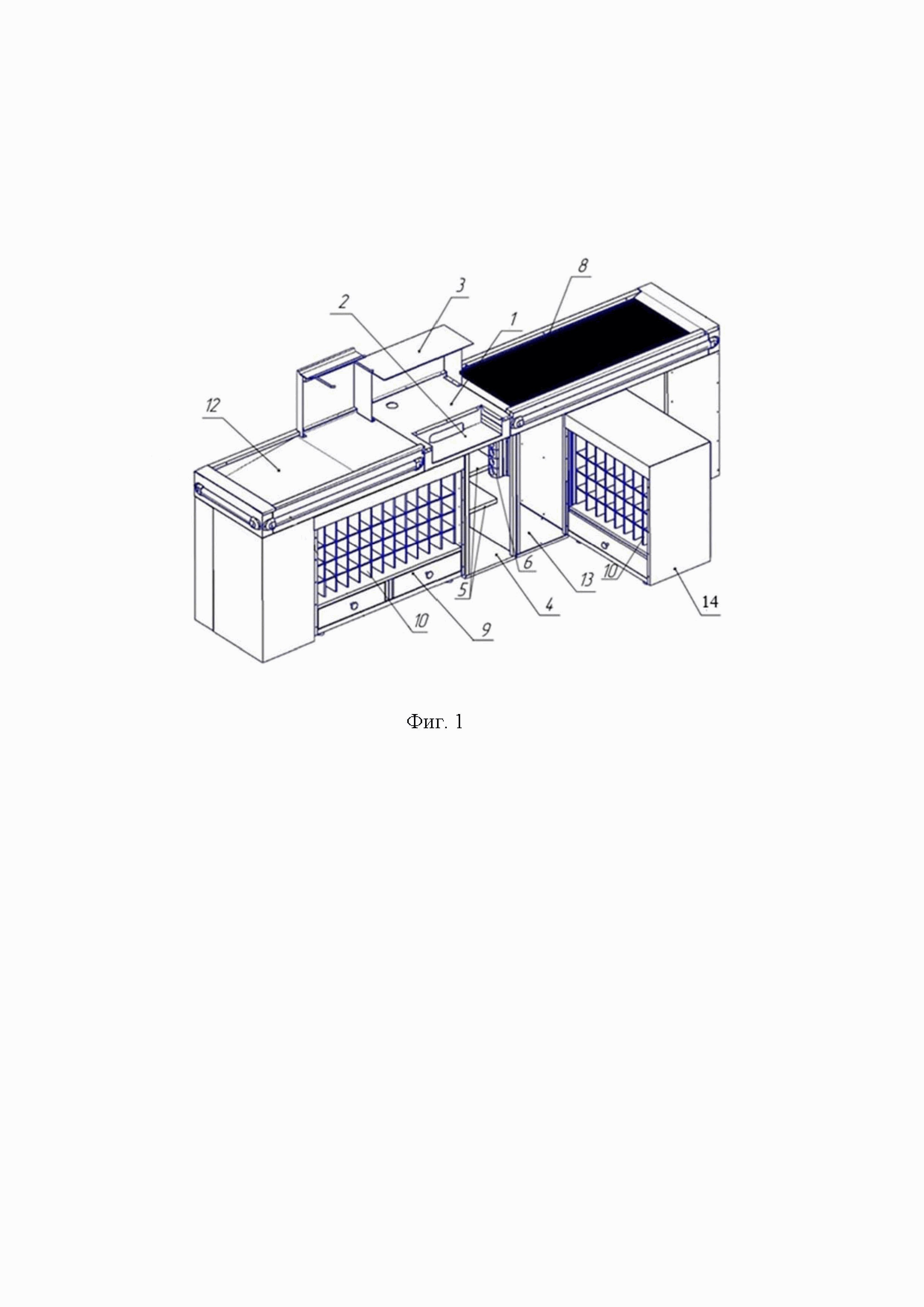 Заявленная конструкция, а именно близкое расположение полок, тумб, транспортера 8, а также наличие толкателей 11, исключает хаотичные движения кассира, сокращает время поиска товаров и оборудования, а также минимизирует ошибки, тем самым увеличивая скорость обслуживания.