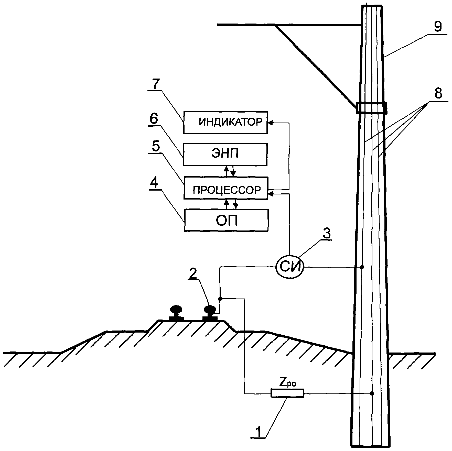 Изобретение относится к контролю коррозионного состояния металлической арматуры железобетонных опор контактной сети и может быть использовано для контроля коррозионного состояния металлической арматуры в других железобетонных изделиях. Нормированным критерием перевода железобетонной опоры контактной сети в дефектную, подлежащую выводу из эксплуатации, служит появление продуктов коррозии металла арматуры на поверхности бетона в подземной части опоры. («Об изменении порядка оценки электрокоррозионной опасности железобетонных опор контактной сети постоянного тока». Технические указания № К - 02/06.; ЦЭт - 2/18 от 15.05.06. ОАО «Российские железные дороги». Департамент электрификации и электроснабжения). Способы контроля коррозионного состояния арматуры в подземной части железобетонных опор основаны на измерении электрохимических и электрофизических характеристик контакта «металл арматуры-электролит» (далее по тексту «металл-электролит»), в частности его поляризуемости, при принудительной поляризации от внешнего источника. Известен способ контроля коррозионного состояния арматуры по величине поляризационного потенциала контакта «металл-электролит» («Прибор диагностирования коррозионного разрушения железобетонных опор контактной сети - ДИАКОР». Руководство по эксплуатации), включающий измерение величины поляризационного потенциала Uпол контакта «металл-электролит» после принудительной его поляризации, в котором между рельсом и арматурой опоры подключают источник напряжения постоянного тока, а между арматурой опоры и электродом сравнения включают вольтметр. По показаниям амперметра устанавливают величину постоянного тока поляризации Iпол=4,5÷6,0 мА, принудительно поляризуют контакт «металл-электролит» в течение нормированного промежутка времени (пять минут), отключают источник поляризации от арматуры и рельса, измеряют вольтметром непосредственно после отключения источника поляризации поляризационный потенциал Uпол контакта «металл-электролит» относительно электрода сравнения, формируют заключение либо о наличии (Uпол≥0,6 В), либо об отсутствии (Uпол<0,6 B) коррозионного разрушения арматуры в подземной части опоры. Недостатком способа являются высокие требования к значению предполяризационного потенциала контакта «металл-электролит», измеренная величина которого перед испытанием должна находиться в диапазоне от минус 0,04 В до минус 0,55 В. Для реализации этого условия оператору необходимо затратить от десятков минут до нескольких часов, что ограничивает практическое применение способа. Наиболее близким заявляемому способу по технической сущности является электрохимический способ контроля состояния арматуры опоры («Указания по техническому обслуживанию и ремонту опорных конструкций контактной сети» (К-146-2002)/ МПС РФ - М.: Трансиздат, 2003, с.12. ЦЭ №197-5/1-2. Технологические карты на работы по содержанию и ремонту устройств контактной сети электрифицированных железных дорог. Книга II «Техническое обслуживание и текущий ремонт», глава 1.2. «Диагностические испытания и измерения». - М.: МПС, Департамент электрификации и электрификации. - 1999. - 427 с.), включающий измерения поляризационного потенциала Uпол контакта «металл-электролит», согласно которому между рельсом и арматурой опоры подключают источник напр