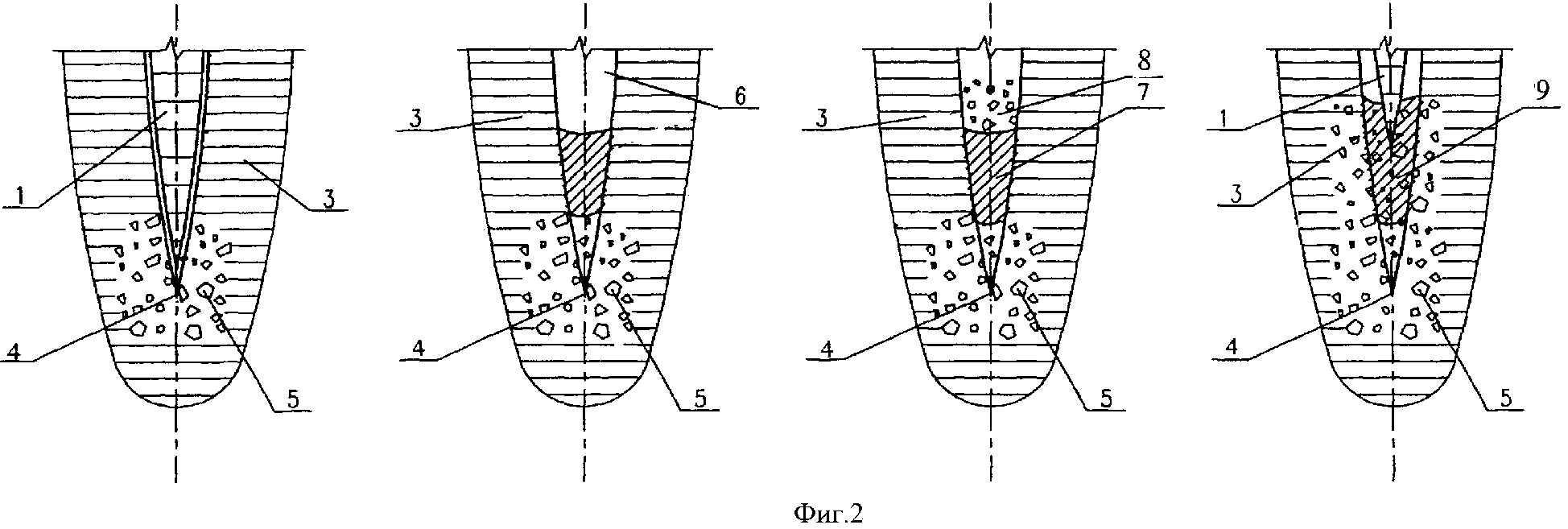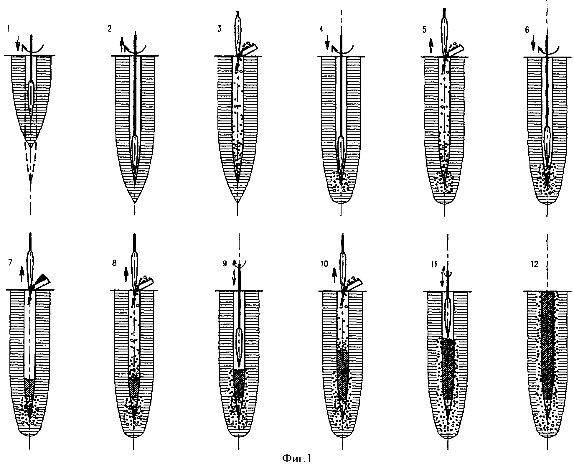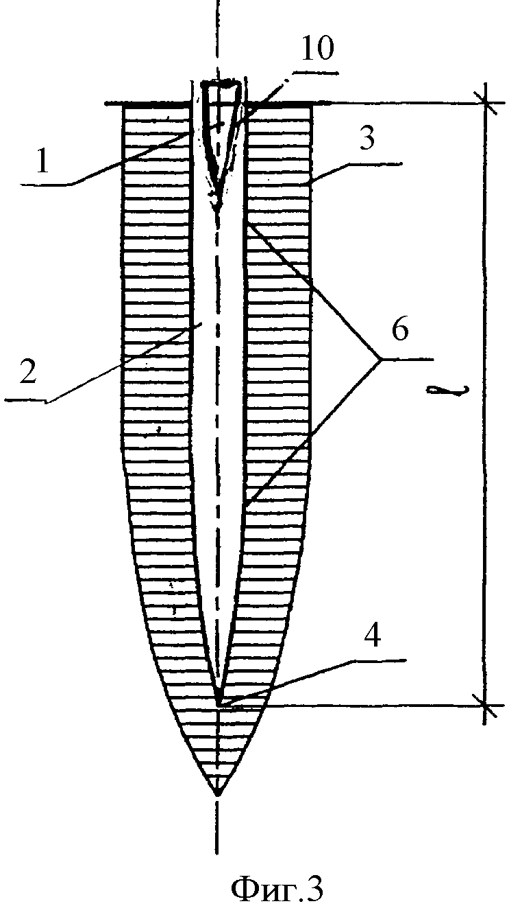 Изобретение относится к фундаментостроению, в частности к возведению свайных фундаментов на грунтовых основаниях: насыпных и естественного сложения, обладающих специфическими (просадочными, набухающими, пучинистыми, плывунными, биогенными и другими) свойствами с применением шлаков черной металлургии. Известен способ строительства набивных свай (1), выбранный в качестве прототипа, включающий образование скважины без выемки грунта и заполнение ее твердеющим материалом, в качестве твердеющего материала используют жесткую сыпучую смесь, которую порционно, послойно подают в скважину, и каждый слой уплотняют. К недостаткам известного способа можно отнести большую трудоемкость и материалоемкость на единицу несущей способности, необходимость применения относительно дорогостоящих привозных материалов (щебня, цемента), повышенные требования, предъявляемые к качеству материалов, технологии приготовления твердеющей смеси, качеству ее укладки и уплотнения, трудоемкость определения прочностных характеристик в теле сваи, недостаточная степень устранения влияния специфических свойств (просадочных, набухающих, пучинистых, биогенных и других) на несущую способность преобразованных оснований фундаментов. Изготовленные данным способом сваи имеют низкую несущую способность, а вибрационное воздействие негативно сказывается на близко расположенные здания, сооружения и подземные коммуникации. Задачей изобретения является преобразование строительных свойств и физико-механических характеристик насыпных грунтов и грунтовых оснований естественного сложения, обладающих специфическими (просадочными, набухающими, пучинистыми, плывунными, биогенными и другими) свойствами, имеющих степень влажности не больше 0,7 с применением шлаков черной металлургии и местного (супесчаного, суглинистого или глинистого) грунта. Это достигается тем, что в способе изготовления набивной сваи, включающем образование скважины без выемки грунта, заполнение скважины послойно твердеющим материалом с последующим уплотнением каждого слоя, согласно изобретению образование цилиндрическо-конической скважины до проектной глубины производят раскаткой, путем вытеснения грунта веретенообразным раскатчиком в околоскважинное пространство, а затем вначале насыщают забой раскатанной скважины порционно шлаковым щебнем до наступления момента условного равновесия между передаваемым на веретенообразный раскатчик полным продольным усилием и реакцией отпора насыщенного шлаковым щебнем забоя, после чего заполняют ствол раскатанной скважины последовательно: вначале порцию грунта, затем порция шлакового щебня, после подачи порции шлакового щебня производят уплотнение порций грунта и шлакового щебня раскаткой при полном продольном усилии на веретенообразный раскатчик, при этом объем порций грунта и шлакового щебня определяют в зависимости от характеристик грунта. Цикл повторяют до полного заполнения ствола скважины. Устье скважины заполняют порцией шлакового щебня с уплотнением раскаткой при полном продольном усилии на веретенообразный раскатчик. При изготовлении сваи в мерзлом грунте или насыпном грунте, имеющем крупные твердые включения, диаметром больше Изготовленные предложенным способом сваи позволяют преобразовать строительные свойс
