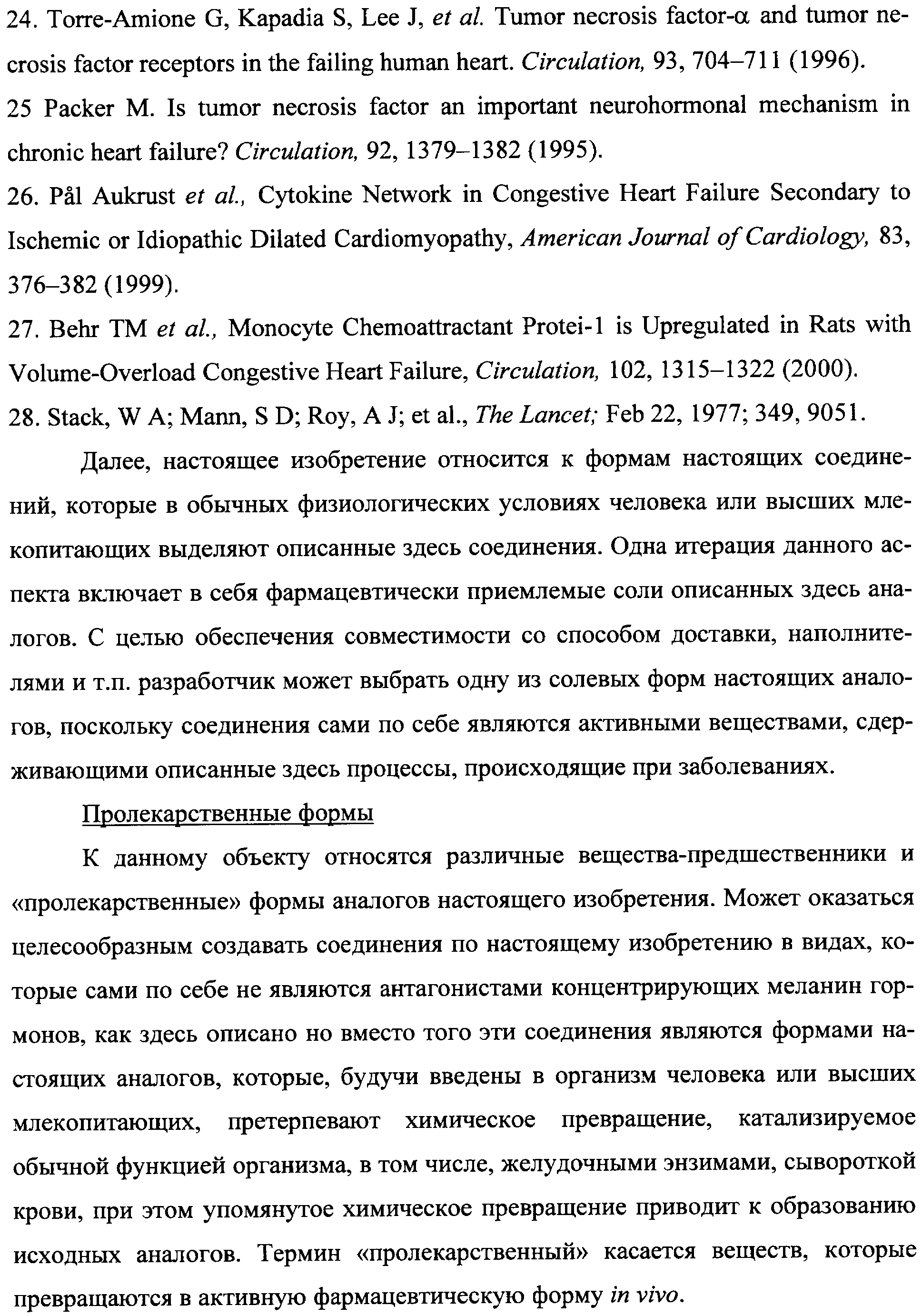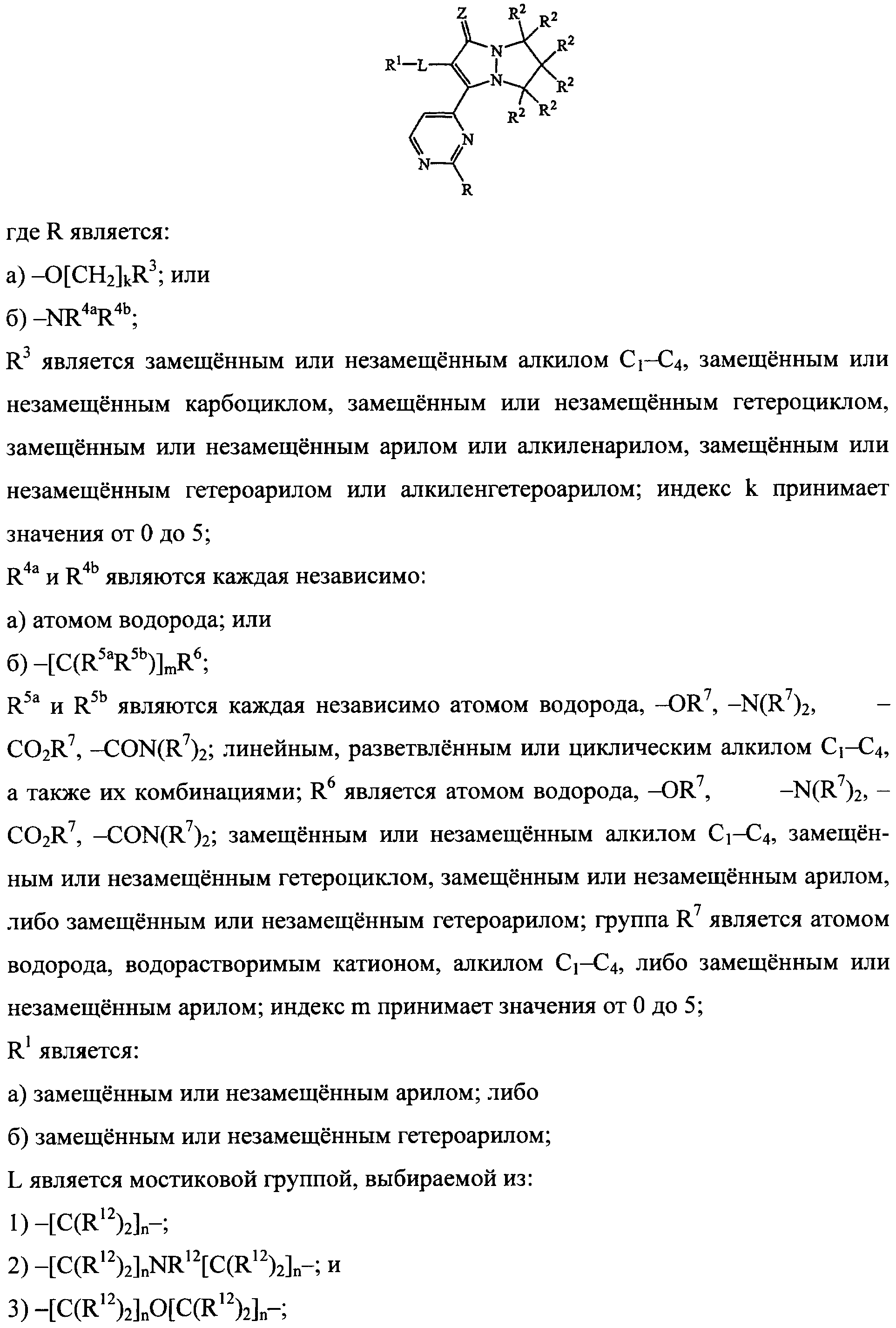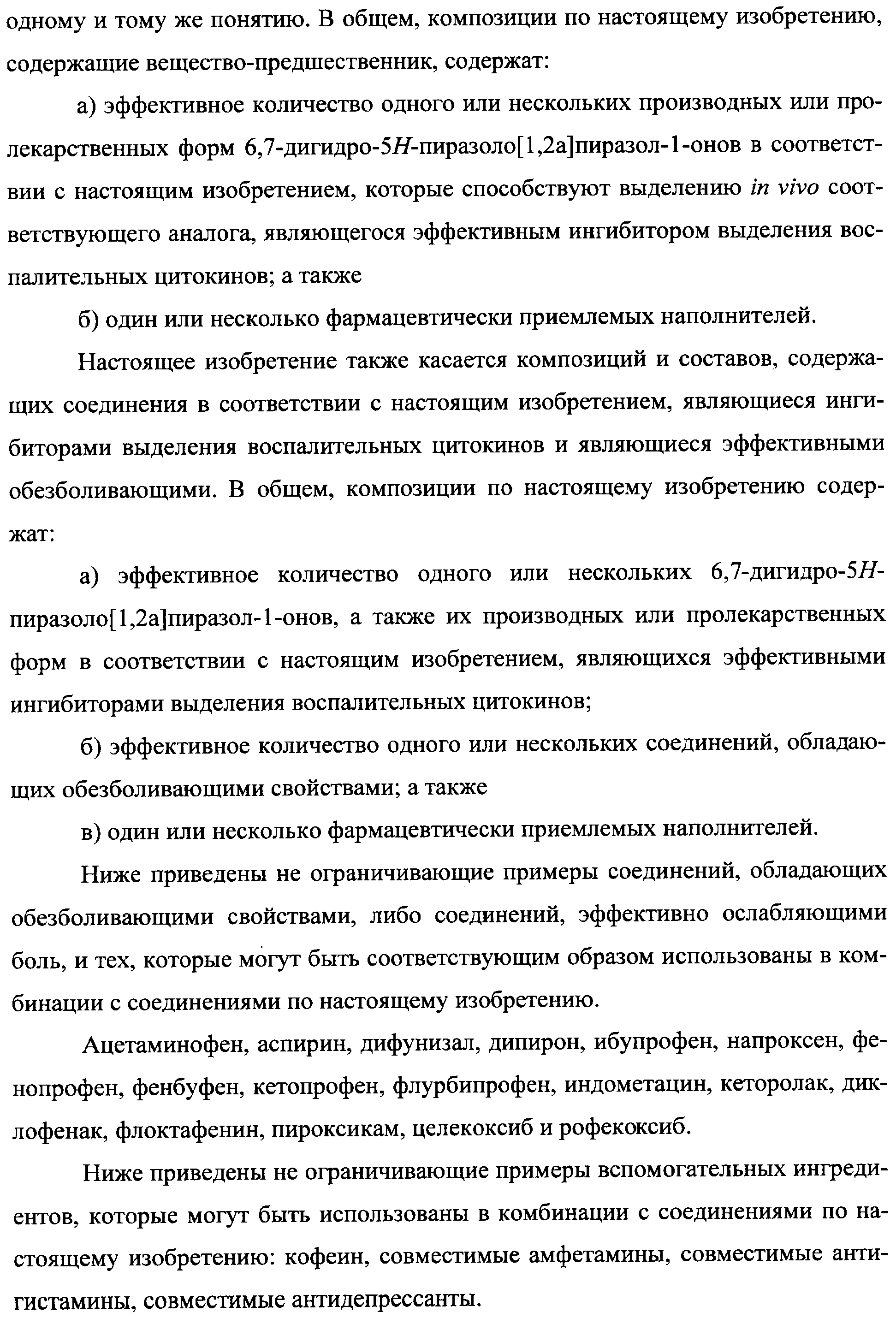 Настоящее изобретение относится к 6,7-дигидро-5Н-пиразоло[1,2а]пиразол-1-онам общей формулы (I), включая все их энантиомерные и диастереомерные формы, а также их фармацевтически приемлемым солям, которые ингибируют нежелательное или чрезмерное выделение клетками воспалительных цитокинов, выбранных из ФНО-α и ИЛ-1β, и могут быть использованы при лечении, например, застойной сердечной недостаточности. В формуле (I): ! ! R является: a) -O[CH2]kR3, где k=0; или ! б) -NR4aR4b; R3 является замещенным или незамещенным фенилом, в котором заместители выбираются из галогена, C1-C4 алкила; один из R4a и R4b является независимо атомом водорода; а другой из R4а и R4b является б) -[C(R5aR5b)]mR6; R5a и R5b является каждая независимо атомом водорода, линейным, или разветвленным алкилом С1-С4, ! R6 является замещенным или незамещенным алкилом С1-С4, в котором заместители выбираются из -OR7, циано, фенилом, 6-членным насыщенным гетероциклом, содержащим в качестве гетероатома атом азота, незамещенным 5-6-членным гетероарилом, содержащим 1-2 гетероатома, выбираемых из азота и кислорода; группа R7 является атомом водорода, водорастворимым катионом, алкилом С1-С4, индекс m принимает значения от 0 до 5; R1 является: а) незамещенным или замещенным 1-2 заместителями, выбранными из галогена или ! C1-6алкила, фенилом; L является мостиковой группой, выбираемой из: 1) -[C(R12)2]n-, где каждый из R12 означает водород или вместе две группы R12 образуют карбонильную группу, n=1-2; 2) -[C(Rl2)2]nNR12[C(R12)2]n-, выбираемый из группы -[CH2]nNHC(O)-, где n=1-2; и ! 3) -[C(Rl2)2]nO[C(Rl2)2]n-, где n=0; каждый из фрагментов R2 независимо выбирается из водорода; Z является О. 5 н. и 19 з.п. ф-лы, 10 табл.