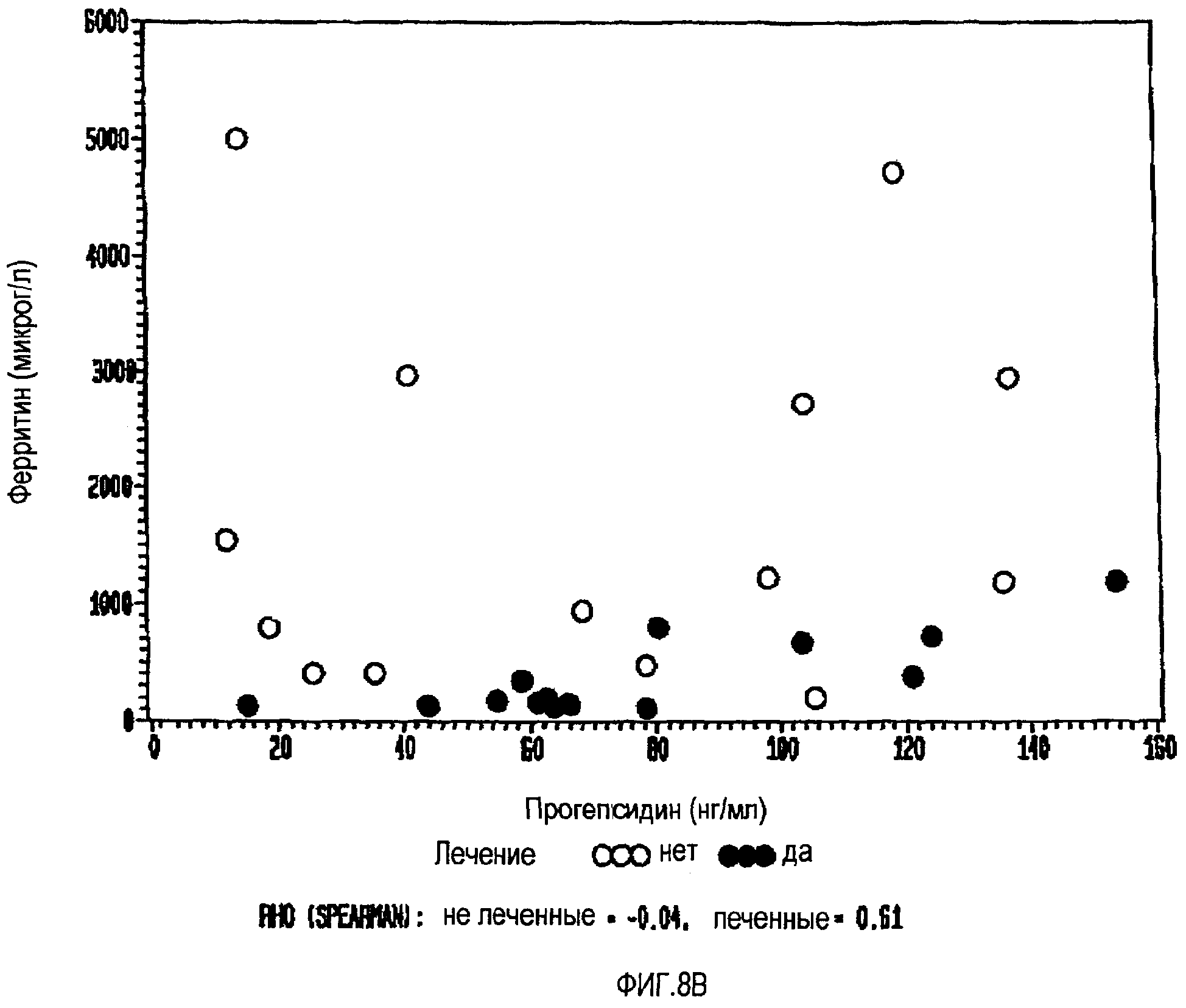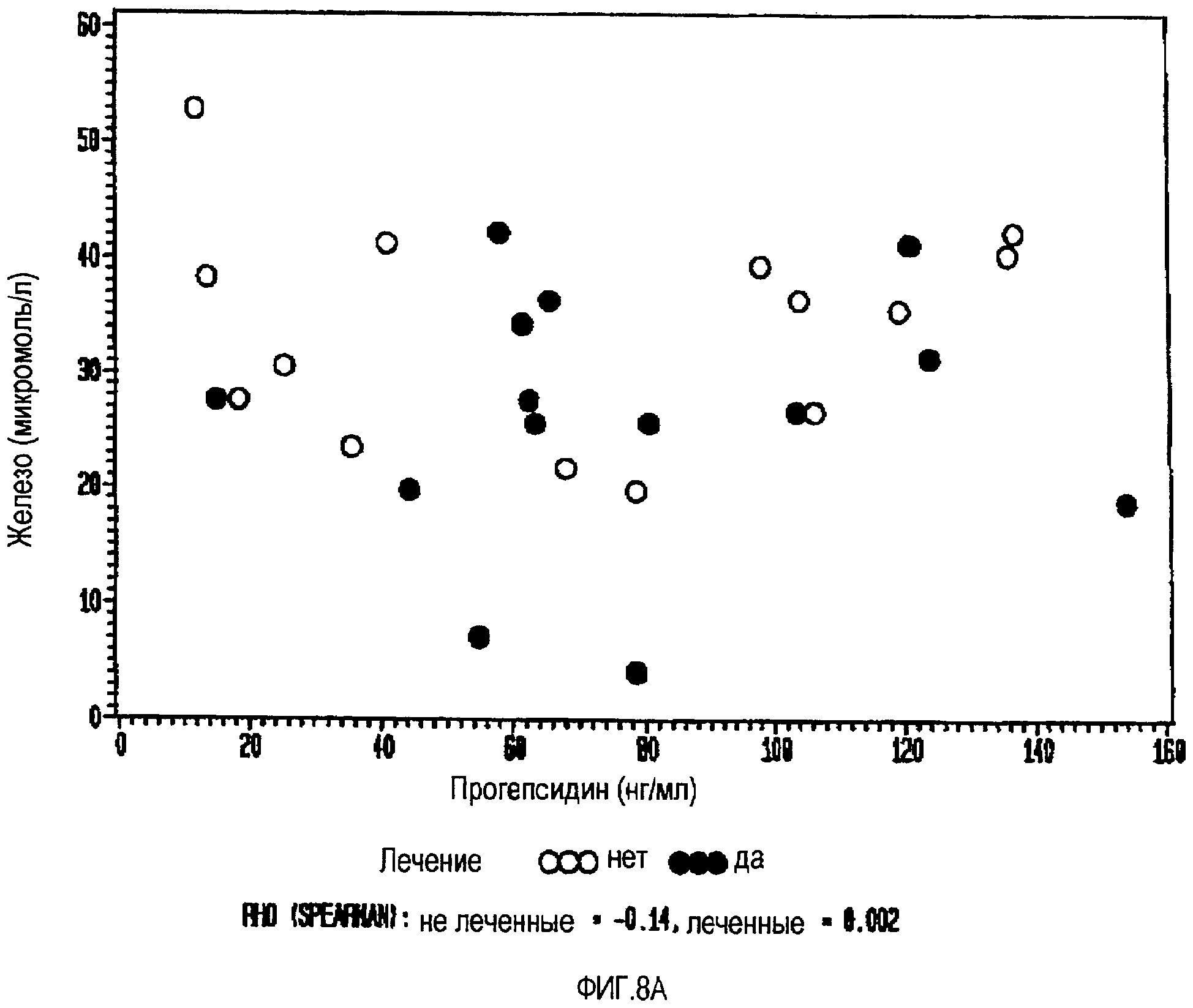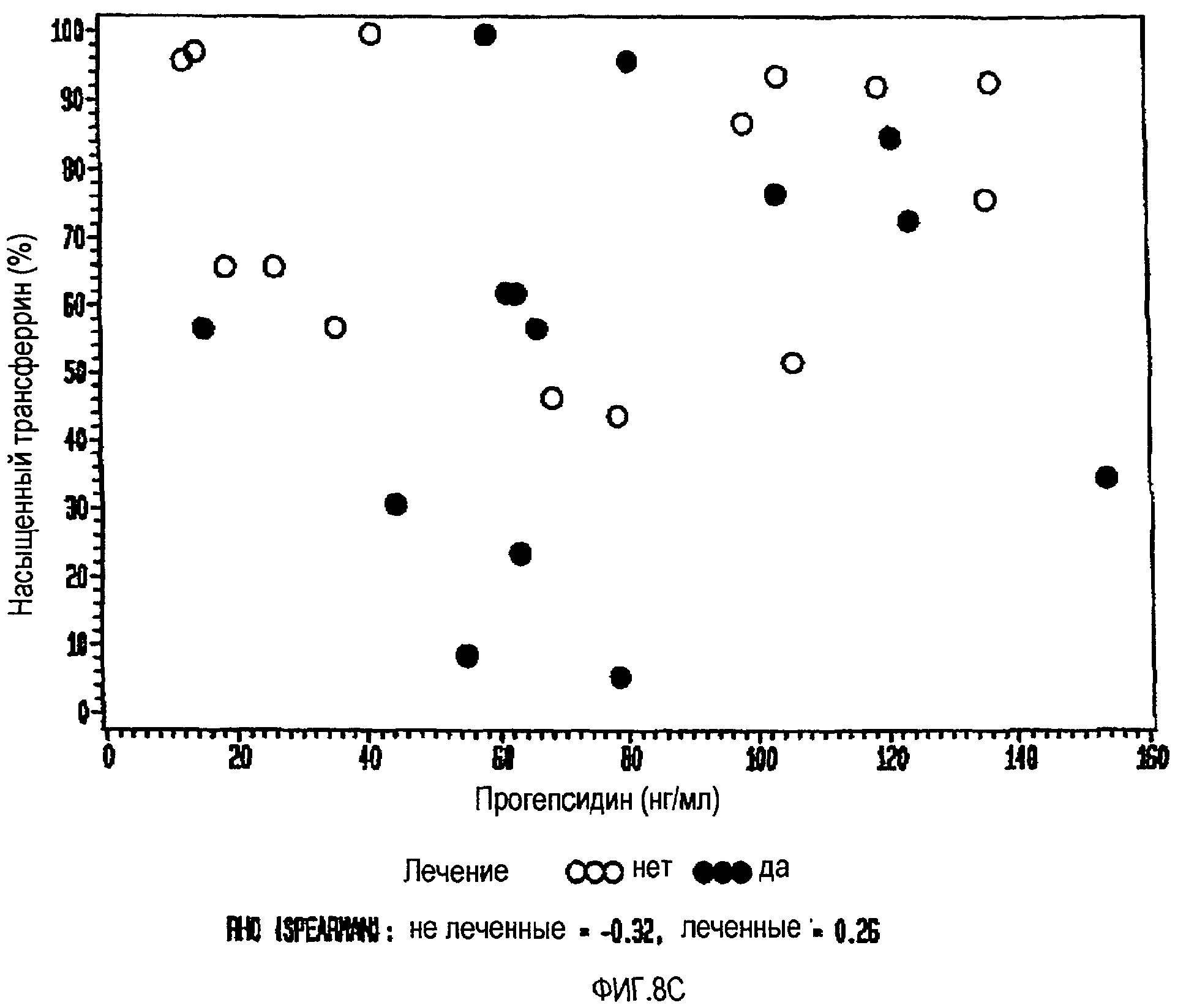 Данная заявка является частичным продолжением заявки №10/441089, зарегистрированной 19 мая 2003 г., которая является частичным продолжением заявки №10/299486, зарегистрированной 19 ноября 2002 г. Железо является существенным микроэлементом, который требуется для роста и развития всех живых организмов; оно обязательно для синтеза ДНК и широкого спектра метаболических процессов. Однако нарушения метаболизма железа связаны с рядом существенных заболеваний млекопитающих, включая, но не ограничиваясь этим, железодефицитную анемию, гемосидероз или гемохроматоз, заболевание с перегрузкой железом (Pietrangelo, А., (2002) Am J Physiol. Gastrointest. Liver Physiol. 282, G403-414; Andrews, N.C. (2000) Annu. Rev. Genomics Hum. Genet. 1, 75-98; Philpott, C.C. (2002) Hepatology 35, 993-1001; Anderson and Powell, (2002) Int J Hematol 76, 203-203; Beutler et al., (2001) Drug-Metab. Dispos. 29, 495-499). В физиологических условиях содержание железа у человека регулируется контролируемой адсорбцией. У млекопитающих адсорбция железа осуществляется преимущественно в двенадцатиперстной кишке и верхних отделах тощей кишки, и это является единственным механизмом, с помощью которого железо запасается и физиологически контролируется (Philpott, С.С. (2002) Hepatology 35, 993-1001). После адсорбции железо связывается с циркулирующим трансферрином и доставляется к тканям организма. В печени, главном месте запасания железа, связанное с трансферрином железо захватывается клетками с помощью опосредованного рецепторами эндоцитоза через классический трансферриновый рецептор (TfR1) (Collawn et al. (1990) Cell 63, 1061-1072) и, вероятно, в больших количествах через недавно идентифицированный гомологичный трансферриновый рецептор 2 (TfR2) (Kawabata et al. (1999) J Biol Chem 274, 20826-20832). Внеклеточный домен данного белка на 45% идентичен соответствующей части TfR1 (там же). TfR2 может также связывать трансферрин в связи с двумя молекулами железа и способствовать захвату железа. Мутации TfR2 связаны с определенными формами гемохроматоза, демонстрируя важную роль TfR2 в гомеостазе железа (Philpott, С.С. (2002) Hepatology 35, 993-1001; Camasehella et al., (2000) Nat. Genet. 25, 14-15; Fleming et al., (2002) Proc. Natl. Acad. Sci. USA 99, 10653-10658). TfR2 экспрессируется преимущественно в печени (Fleming et al., (2000) Proc. Natl. Acad. Sci. USA 97, 2214-2219; Subramaniam et al., (2002) Cell Biochem. Biophys. 36, 235-239), однако его точная клеточная локализация до сих пор не известна. Существует механизм обратной связи, который увеличивает абсорбцию железа у индивидуумов с дефицитом железа, в то время как абсорбция железа снижается у людей с избытком железа (Pietrangelo, А., (2002) Am J Physiol Gastrointest Liver Physiol 282, G403-414; Philpott, C.C. (2002) Hepatology 35, 993-1001; Anderson and Powell, (2002) Int J Hematol 76, 203-203). При наследственном гемохроматозе (НН), однако, данный регуляторный механизм, очевидно, нарушается; несмотря на избыток железа, повышенное количество железа абсорбируется из пищи, и это ведет к аккумуляции избытка железа во внутренних органах, приводя к дисфункции и недостаточности органов. Молекулярные механизмы, с помощью которых кишечник отвечает на изменения в потребностях организма в железе, плохо изучены. В данном контексте гепсидин, недавно идентифицированный пептид млекопитающих (Krause et al. (2000) FEBS Lett 489, 147-150: Park et al. (2001) J Biol Chem 276, 7806-7810), претендует на роль ключевого сигнального компонента, регулирующего гомеостаз железа (Philpott С.С. (2002) Hepatology 35, 993-1001; Nicolas et al. (2002) Proc Natl Acad Sci USA 99, 4596-4601). Гепсидин представляет собой небольшой обогащенный цистеином пептид, продуцируемый преимущественно в печени. Данная молекула регулирует абсорбцию