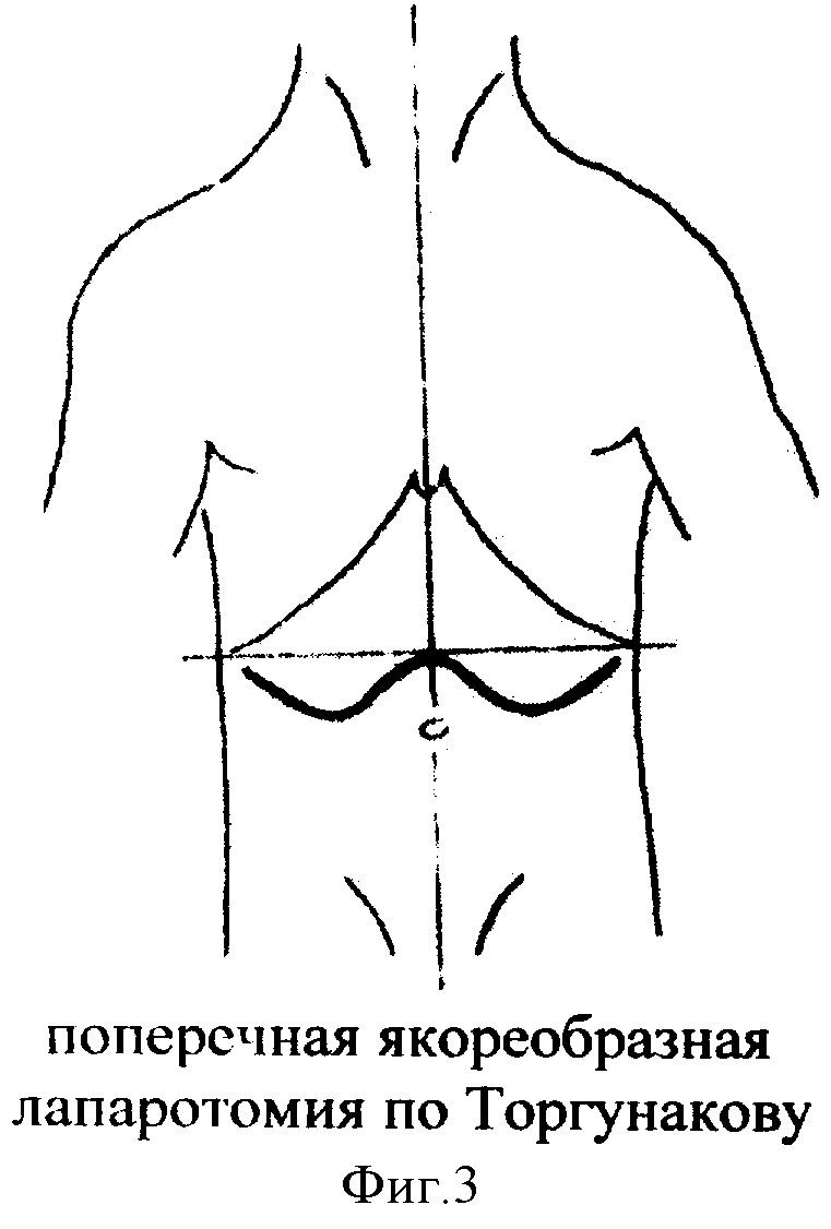 Изобретение относится к области медицины, а именно к хирургии. Существуют способы верхней поперечной лапаротомии с проведением разреза дугообразно вверх и в поперечном направлении (Keown, River и др.), (фиг.1 и фиг.2). Недостатком этих доступов является большая травматичность из-за пересечения косых мышц живота и многих сосудисто-нервных пучков. Уменьшает этот недостаток способ лапаротомии А.с. №787003 (фиг.3), при котором ткани рассекают от концов десятых ребер до парастернальной линии в соответствии с ходом сосудисто-нервных пучков, а далее - дугообразно вверх к срединной линии, достигая уровня концов десятых ребер. Другая половина разреза симметрично повторяет первую. Недостатком этого способа лапаротомии является неудовлетворительные пространственные условия для манипуляции на органах поддиафрагмального пространства. Целью настоящего изобретения является облегчение манипуляций на органах поддиафрагмального пространства путем дополнительного рассечения тканей по срединной линии (фиг.4). Эта цель достигается тем, что рассекают ткани по срединной линии вверх до мечевидного отростка. Способ осуществляется следующим образом. Кожу и подкожную клетчатку рассекают от левой передней подмышечной линии на уровне концов десятых ребер до парастернальной линии, в соответствии с ходом сосудисто-нервных пучков, далее разрез ведут дугообразно кверху к срединной линии, достигая точки на уровне концов десятых ребер. Правая половина разреза симметрично повторяет левую. Пересекают прямые мышцы живота, круглую связку печени, апоневрозы боковых мышц брюшной стенки. Волокна боковых мышц живота раздвигают тупым путем. Далее рассекают ткани по срединной линии кверху до мечевидного отростка. По окончании операции рана зашивается послойно. Предложенный способ позволяет облегчить манипуляции на органах поддиафрагмального пространства путем улучшения пространственных условий в ране, что способствует уменьшению осложнений во время операции. Авторы провели сравнительное изучение пространственных характеристик прототипа и верхней срединной лапаротомии к органам верхнего этажа брюшной полости и надпочечникам на 102 нефиксированных трупах. Из таблицы 1 следует, что из поперечной якореобразной лапаротомии к кардиальному отделу пищевода, малой кривизне желудка, левому надпочечнику пространственные условия неудовлетворительные и хуже, чем при верхней срединной лапаротомии. Проведено сравнение пространственных условий прототипа, то есть «якореобразной» лапаротомии (я) и настоящего изобретения, «полного якореобразного» доступа (пя). Результаты представлены в таблице 2, из которой видно значительное улучшение пространственных условий при модификации «якореобразной» лапаротомии путем расширения ее по срединной линии вверх до мечевидного отростка.Таблица 1 Кардиальный отдел пищевода Малая кривизна желудка Левый надпочечник через малый сальник ГР Я 18,63±0,33 9,23±0,33 17,6±0,24 С 14,5±0,36 6,85±0,24 18,8±0,2 УНООД Я 43,3±1,13 67,1±0,95 62,47±0,39 С 54,5±0,99 70,3±0,96 65,77±0,35 УОДД Я 22,3±0,82 53,05±1,84 31,7±0,7 С 28,25±0,87 72,4±2,12 34,8±0,83 УОДШ Я 28,25±1,01 77,75±2,71 22,68±0,73 С 26,65±0,92 64,9±2,35 26,03±0,8 Таблица 2 точка приложения ГЛУБИНА РАНЫ УНООД УОДД УОДШ я пя я пя я пя я пя Кардиальный отдел пищевода 19 8 50 70 30 60 50 60 Малая кривизна желудка 14 3 60 80 45 110 80 120 Левый надпочечник через малый сальник 21 19 65 70 30 35 20 30