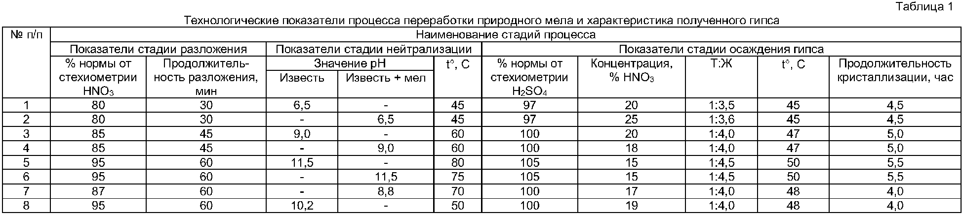 1. Способ получения гипса разложением кальцийсодержащего сырья минеральной кислотой, характеризующийся тем, что в качестве кальцийсодержащего сырья берут природный и/или синтетический мел, разлагают его азотной кислотой, взятой в количестве 80-95% от стехиометрии, процесс ведут 30-60 мин, в полученную суспензию добавляют известь или смесь извести с мелом в количестве, обеспечивающем рН 6,5-11,5, смесь нагревают до Т=45-80°С и разделяют фильтрацией, отделенный раствор нитрата кальция и серную кислоту в количестве 97-105% от стехиометрии одновременно вводят в раствор азотной кислоты с концентрацией 15-25% до получения в смеси Т:Ж=1:(3,5-4,5), которую выдерживают в течение 4,5-5,5 ч при перемешивании и температуре 45-50°С, образовавшийся твердый продукт отделяют фильтрацией и промывают. 2. Способ по п.1, отличающийся тем, что в качестве 15-25% азотной кислоты используют стоки после стадии промывки. 3. Способ по п.1, отличающийся тем, что в качестве азотной кислоты на стадии разложения используют стоки стадии образования гипса.
