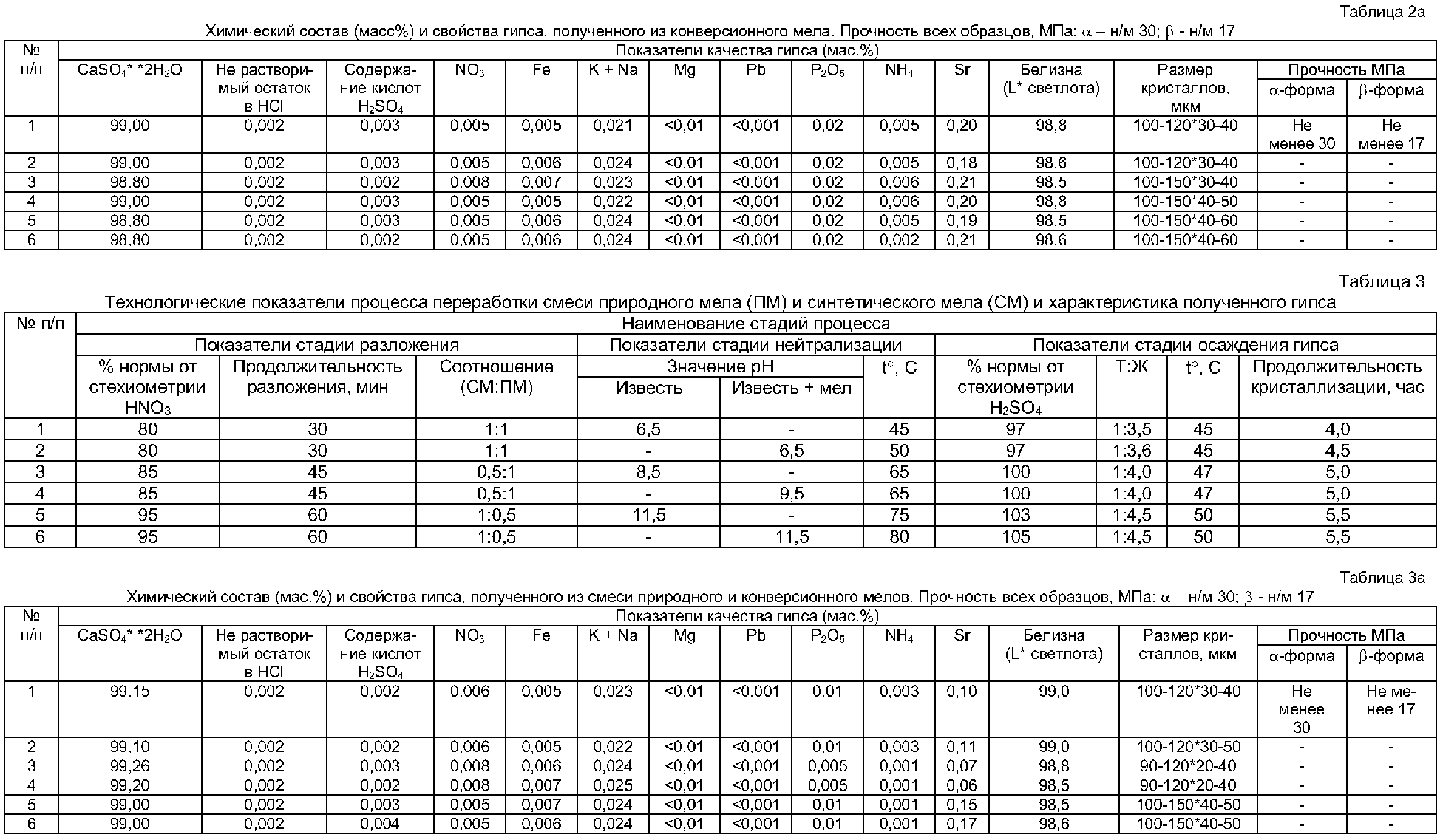 Изобретение относится к способу получения гипса, предназначенного для использования в качестве вяжущего в производстве строительных материалов, а также в химической, медицинской и других отраслях промышленности. Способ характеризуется тем, что в качестве кальцийсодержащего сырья берут природный и/или синтетический мел, разлагают его азотной кислотой, взятой в количестве 80-95% от стехиометрии, процесс ведут 30-60 мин. В полученную суспензию добавляют известь или смесь извести с мелом в количестве, обеспечивающем рН 6,5-11,5, смесь нагревают до Т=45-80°С и разделяют фильтрацией. Отделенный раствор нитрата кальция и серную кислоту в количестве 97-105% от стехиометрии одновременно вводят в раствор азотной кислоты концентрацией 15-25% до получения в смеси Т:Ж=1:(3,5-4,5). Смесь выдерживают в течение 4,5-5,5 часов при перемешивании и температуре 45-50°С. Образовавшийся твердый продукт отделяют фильтрацией и промывают. Изобретение позволяет повысить прочность, белизну и содержание основного вещества в получаемом гипсе. 2 з.п. ф-лы, 6 табл.