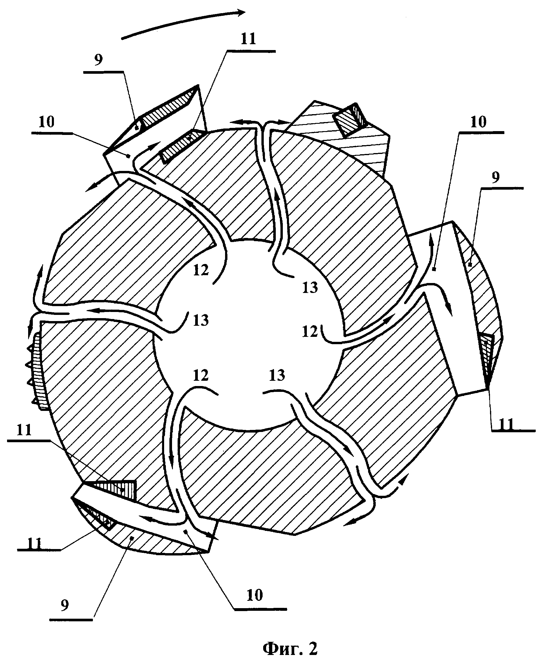 На фиг.1 обозначены: поз.1 - внутренняя полость; 2 - каналы в корпусе 3 для направления промывочной жидкости под углом θ, близким по величине к углу наклона взаимноперекрывающих забой резцов с PDC в центре долота (поз.4). После очистки от выбуренной породы в центральной зоне струи промывочной жидкости плавно переходят на очистку от налипающей породы предпериферийной 5 и периферийной 6 групп соответственно породоразрушающих и калибрующих вставок с PDC, a затем уже омывают стенки лопастей 7 и поверхности корпуса между лопастями 8.