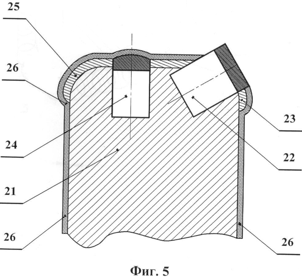 На фиг.5 обозначены: поз.21-25, - как и на фиг.4. Поз.26 - слой кластерного алмазного покрытия, защищающего всю поверхность долота одновременно и от абразивного износа, и от налипания сальниковых масс при прохождении липких и вязких пород.