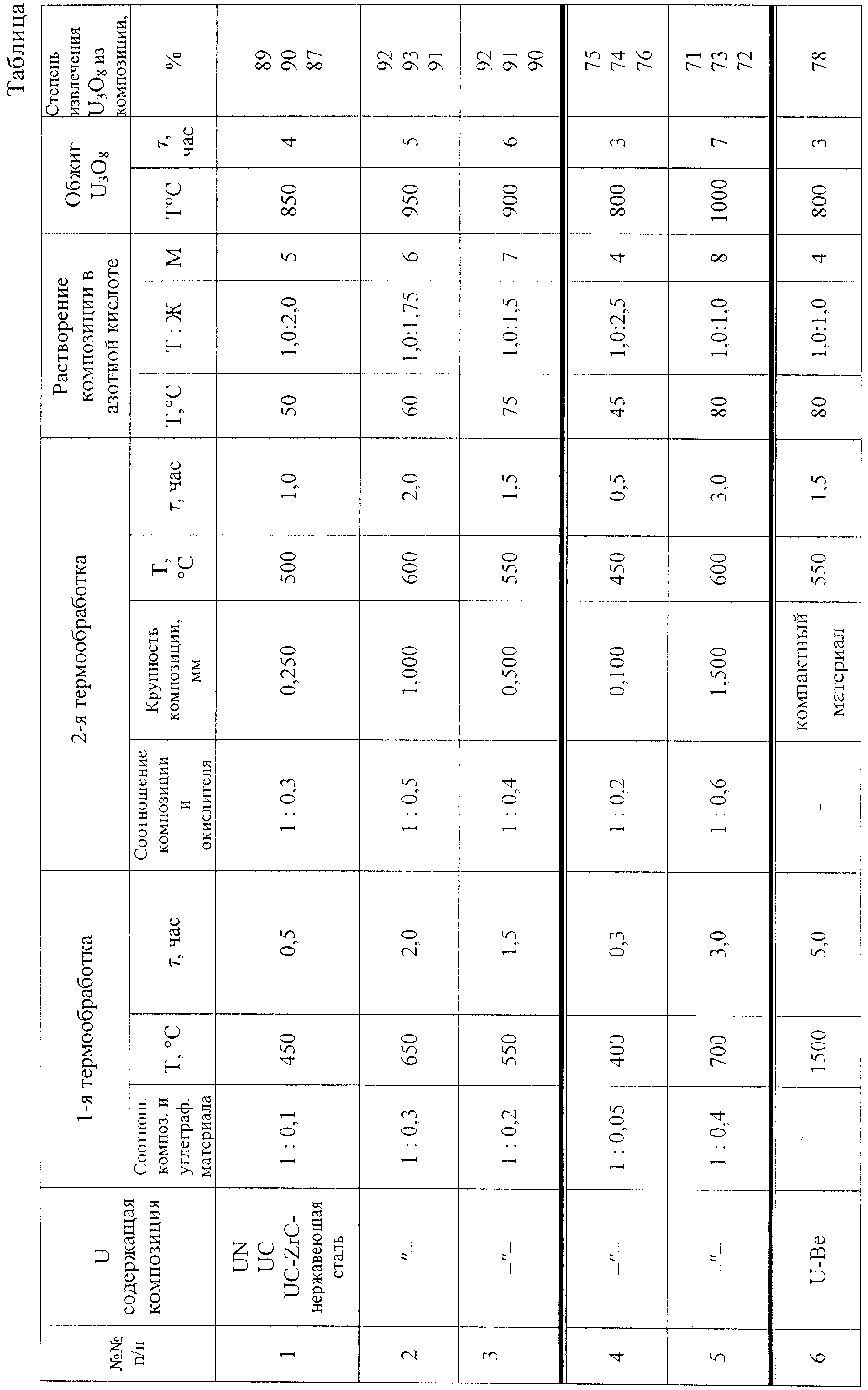 Урансодержащие топливные композиции (UC - ZrC в оболочке из нержавеющей стали, UN, UC) в виде фрагментов тепловыделяющих элементов в количестве 300 г смешивали в соотношении 1,0:0,1-0,3 с углеграфитовым материалом - порошком графита типа 30ПГ фракции около 100 мкм и подвергали первичной термической обработке при температуре 450-650°С в течение 0,5-2 часов.