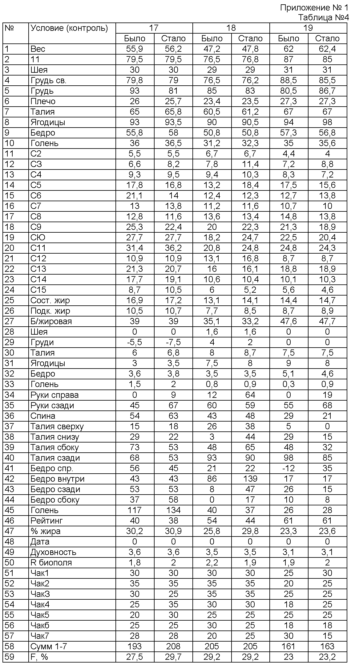Изобретение относится к физической культуре и спортивной медицине, а именно к способам тренировок различной направленности, то есть к способам развития мышечной системы человека, а также ее коррекции путем воздействия на тренируемые мышцы различной физической нагрузкой с учетом факторов физиологического влияния сбалансированного питания на организм человека и на состав его тела. Данное изобретение может быть использовано в качестве комплексного современного метода повышения эффективности тренировок не только спортсменов, но и оздоровления широких масс населения путем расширения функциональных возможностей организма благодаря рациональному построению этих тренировок. Известно, что в настоящее время отмечается большой интерес к оздоровительным формам физической культуры с улучшением пропорции тела, таким как избирательная тренировка частей тела человека типа «шейпинг». Система тренировок типа «шейпинг» используется в значении, включающем в себя процесс целенаправленной избирательной тренировки при проведении по катаболической и анаболической программам коррекции (формированию) отдельных частей тела, улучшению физического состояния и укрепления здоровья, осуществляемой на основании предварительного изучения: 1. Уровня физического состояния. 2. Индивидуальных параметров телосложения и сравнения их с выбираемыми модельными характеристиками. Для чего проводятся антропометрические первоначальные измерения (размеров, форм, пропорций, количественного состава тела, жира, мышц и т.д.). Кроме того, термин включает не только перечисленные условия, но и новую концепцию мышления и взглядов на эстетическое отношение к внешнему виду и стилю жизни современного человека и соответствующую этому эффекту - коррекцию телосложения с повышением тонуса корректируемых мышц и омолаживающего эффекта. Широко используемые в настоящее время различные виды массовой физической культуры для женщин (ритмическая, атлетическая гимнастика) по тем или иным причинам не решают в полной мере одну из основных задач, которую ставят перед собой женщины приступая к систематическим занятиям массовым спортом, а именно улучшение их физической внешности. Вместе с тем, впервые проведенное нами изучение мотивов для занятий физическими упражнениями показало, что большинство из 2000 опрошенных женщин, занимающихся на базе залов Федерации шейпинга России в различных группах здоровья, желают иметь хорошую фигуру, отвечающую современному требованию к здоровью и красоте, в какой бы она форме не выражалась: привлекательность, красивые линии тела и хорошая фигура, походка, стройность, осанка и т.д. Это и послужило основанием разработки нового комплексного метода физической тренировки для женщин, который бы сочетал в себе физические упражнения и дополнительные воздействия, такие как различные формы компенсаторного питания, прием витаминов и т.п., например, с использованием в рационе питания озвученных в определенных условиях напитков, употребляемых непосредственно после тренировки, оказывающих влияние и на увеличение работоспособности организма, но с избирательным изменением размеров и пропорций тела по желаемой шейпинг-модели, и др. физиотерапевтических методов. Известны способы тренировок различной направленности, которые являются анало