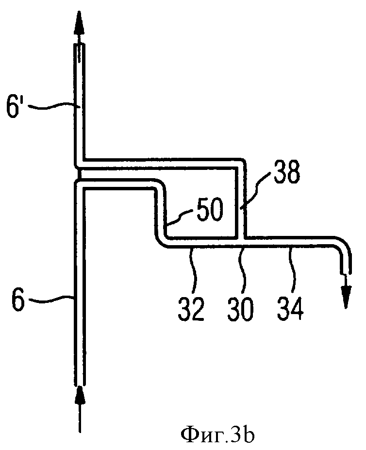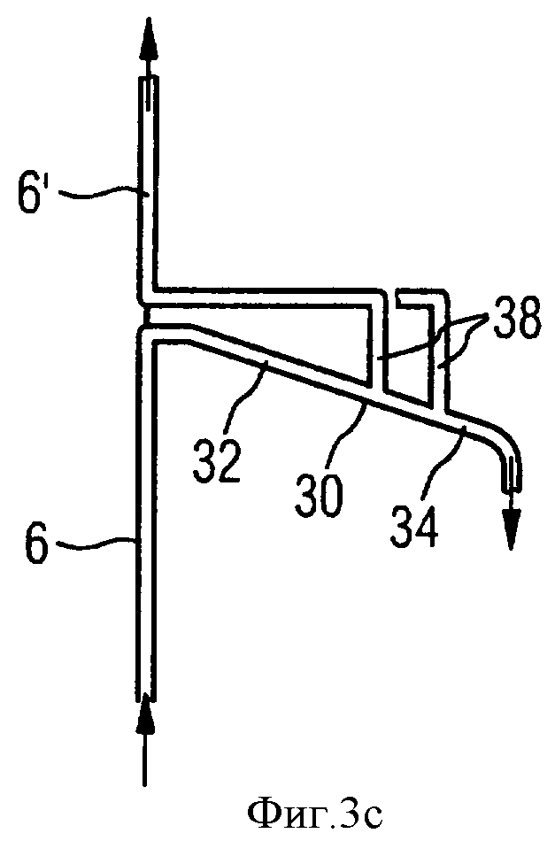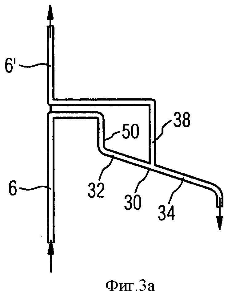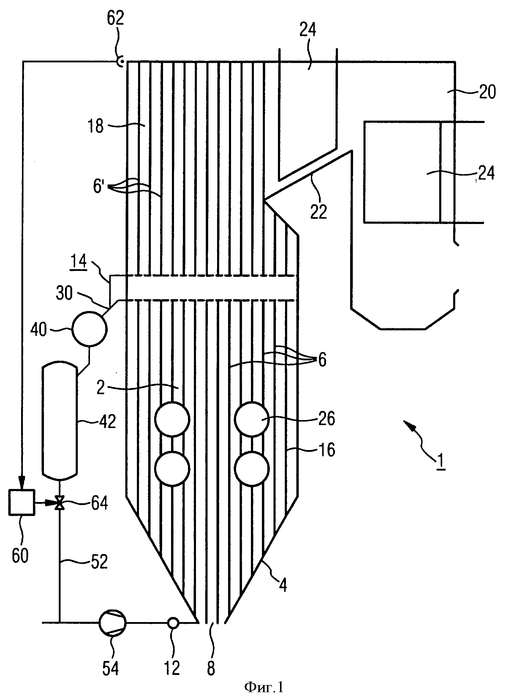 1. Прямоточный парогенератор (1) с образующей газоход (20) ограждающей стенкой (2), которая образована в нижней области из газоплотно сваренных друг с другом испарительных труб (6) и в верхней области из газоплотно сваренных друг с другом перегревательных труб (6'), причем перегревательные трубы (6') включены после испарительных труб (6) на стороне текучей среды через водоотделительную систему (14), отличающийся тем, что водоотделительная система (14) имеет множество водоотделительных элементов (30), из которых каждый соответственно подключен на стороне потока текучей среды после или соответственно перед меньше, чем десятью испарительными трубами (6), предпочтительно одной единственной испарительной трубой и/или меньше, чем десятью перегревательными трубами (6'), предпочтительно одной единственной перегревательной трубой (6'), причем соответствующий водоотделительный элемент (30) содержит соединенный с предвключенными испарительными трубами (6) входной отрезок трубы (32), который при рассмотрении в своем продольном направлении переходит в водоотводящий отрезок трубы (34), причем в переходной области (36) ответвляется множество соединенных соответственно с подключенными дальше перегревательными трубами (6') выходных отрезков трубы. 2. Парогенератор (1) по п.1, отличающийся тем, что в области испарительных труб (6) в ограждающей стенке (2) расположено множество горелок, причем водоотделительные элементы (30) позиционированы на высоте не больше, чем 20 м выше соответственно самой высокой горелки. 3. Парогенератор (1) по п.1, отличающийся тем, что входной отрезок трубы (32) обтекается через приходящее сверху колено трубы. 4. Парогенератор (1) по п.1, отличающийся тем, что водоотводящий отрезок трубы (34) в переходной области (36) своим продольным направлением расположен наклонно вниз относительно горизонтали в направлении потока. 5. Парогенератор (1) по п.1, отличающийся тем, что водоотводящий отрезок трубы (34) в своей входной области выполнен в виде изогнутого вниз колена трубы. 6. Парогенератор (1) по одному из пп.1-5, отличающийся тем, что водоотделительные элементы (30) на стороне выхода воды соединены группами с множеством общих выходных коллекторов (40). 7. Парогенератор (1) по п.6, отличающийся тем, что после выходных коллекторов (40) подключено множество водосборных баков (42). 8. Парогенератор (1) по п.7, отличающийся тем, что в подключенную к водосборным бакам (42) сливную линию (52) включен управляемый через соответствующее регулирующее устройство (60) установочный вентиль (64), причем регулирующее устройство (60) является нагружаемым входным значением, характеристическим для энтальпии текучей среды на выходе на стороне пара подключенной после водоотделительной системы (14) перегревательной поверхности нагрева (18). 9. Парогенератор (1) по п.8, отличающийся тем, что через регулирующее устройство (60) является управляемым присвоенный испарительным трубам (6) циркуляционный насос (54).