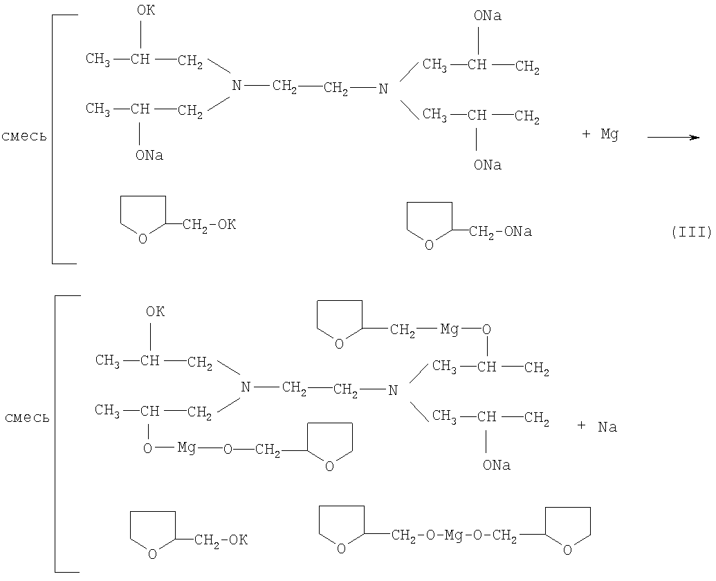 Изобретение относится к области получения каучуков растворной полимеризации полибутадиенов, от жидких до высокомолекулярных. Полибутадиены используются в лакокрасочной, резинотехнической промышленности для получения ударопрочного полистирола и АБС пластиков, в шинной промышленности. Известен способ получения полибутадиена в присутствии инициирующей системы в виде комплекса магния, натрия и калия типа MeR3Mg, где Me - натрий или калий в сочетании с алкиллитием (Корнилова Т.А., Эзерц Н.Ю. «Исследования в области синтеза полидиенов методом анионной полимеризации в растворе с использованием магнийсодержащих каталитических систем», «Каучук и резина», 1990, №2, стр.5-11). Недостатком указанной каталитической системы является низкая скорость полимеризации. Известен способ получения полидиенов в присутствии каталитической системы, включающей литийорганический инициатор, диалкилмагниевое соединение, триалкилалюминиевое соединение, а в качестве электродонора оксолановое соединение 2,2-бис(2-оксоланил)пропан. Инициатором полимеризации является н-бутиллитий. Молярное соотношение инициатора к оксоланиловому соединению находится в диапазоне от 20:1,0 до 1,0:2,0, а расход инициатора на 100 г мономера находится в диапазоне 0,2-100 ммоль. Температура полимеризации поддерживается на уровне от 0 до 160°С. Полученный полимер содержит 1,2-звенья в количестве от 20 до 95% (Патент США №4429090, МКИ C08F 36/04; 36/00; 004/48, опубл. 31.01.1984). Недостатком указанного способа получения полибутадиена являются: невозможность получать полибутадиен с низким содержанием винильных звеньев (ниже 20%) и отсутствие приемов, предотвращающих обрастание поверхности полимеризатора гелеобразным полимером. Известен способ получения полимеров сопряженных диенов с содержанием 1,2- или 3,4-звеньев не менее 60% методом анионной полимеризации бутадиена или изопрена с использованием биметаллических инициаторов общей формулы NaMgR3, где R - алкильный радикал с содержанием атомов углерода от 2 до 14, циклоалкил, арил в присутствии олигомерного оксоланилалкана: например, димерного 2,2-бис(2-оксаланил)пропана при мольном отношении последнего к биметаллическому инициатору от 0,5:1,0 до 10:1,0, дезактивацией катализатора выделением и сушкой полимера известными методами. Молекулярная масса полимера в зависимости от условий полимеризации находится в пределах от 1000 до 500000 (Патент США 4647635, МКИ C08F 36/04, 36/00, 4/00, 4/44, 004/08, опубл. 04.03.1987). Недостатком указанного способа является «обрастание» полимеризатора гелеобразным полимером, что требует частой чистки полимеризатора. При этом наблюдается большие потери полимера в виде нерастворимого геля. Известен способ получения низкомолекулярного полибутадиена полимеризацией бутадиена-1,3 в углеводородном растворителе в присутствии каталитической системы, состоящей из органического соединения магния и алкоксида щелочного металла, где в качестве органического соединения магния используют бутил-2-этилгексилмагний в количестве 15-20 моль на тонну мономера, а в качестве алкоксида щелочного металла используют тетрагидрофурфурилат натрия или калия при молярном соотношении магний:щелочной металл, равном от 1:0,25 до 1:2,0. Полимеризацию проводят в толуоле при температуре 20-80°С при непрерывной подаче бутадиена в толуол, куда загружена каталитическая система (Патент РФ №2082720, МПК С08F 136