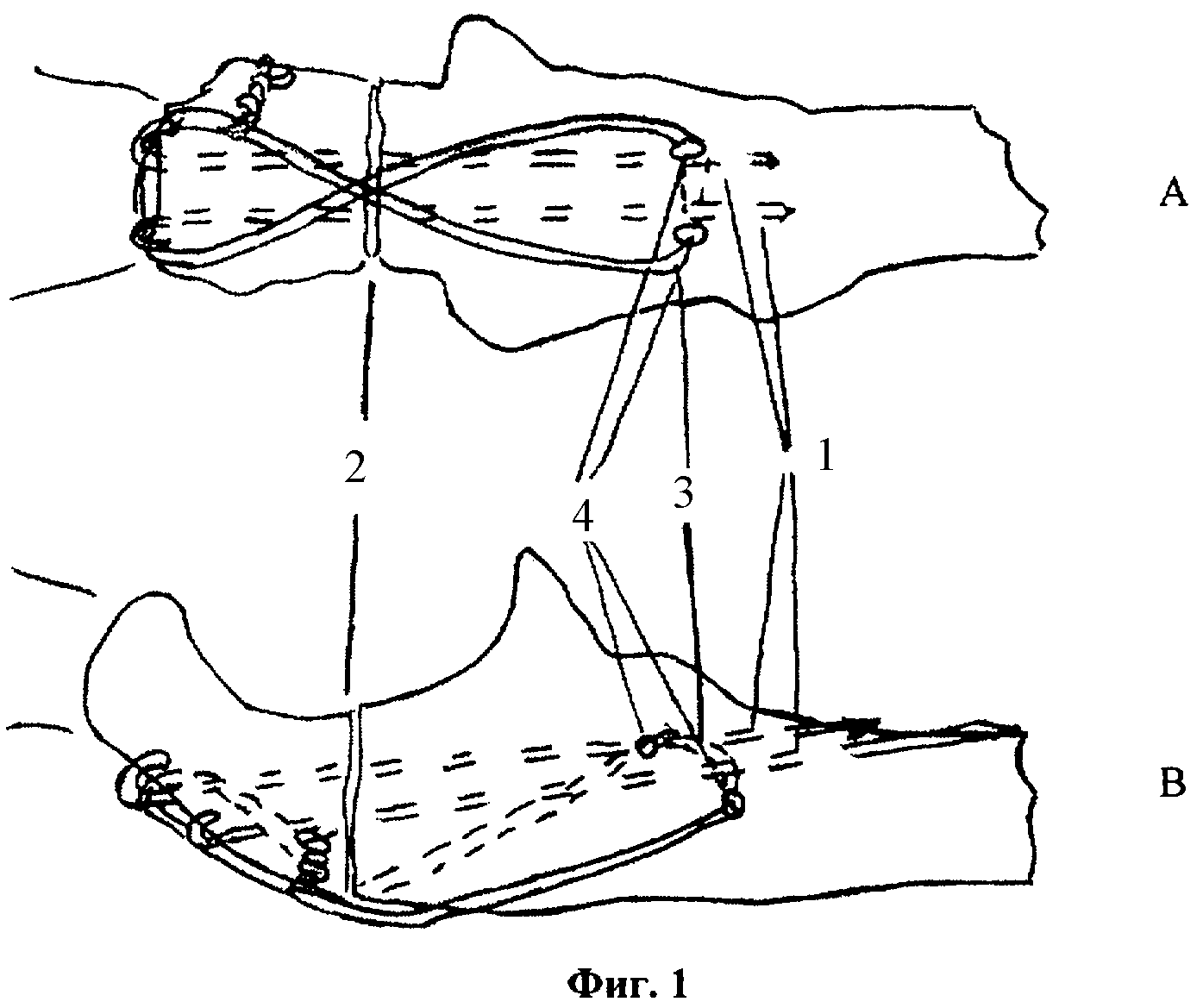 Предложенный способ пояснен на фиг.1, где 1 - спицы Киршнера, 2 - зона перелома локтевого отростка, 3 - стягивающая проволочная петля, 4 - отверстия в кортикальном слое локтевой кости.