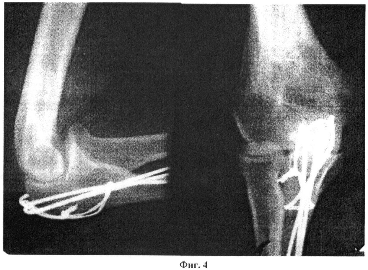 Пациент С., 45 лет. Диагноз: закрытый перелом правого локтевого отростка со смещением отломков. На фиг.2 представлена рентгенограмма до операции. Произведена открытая репозиция перелома, в соответствии с предложенным способом введены спицы Киршнера и стягивающая проволочная петля (на фиг.3 представлена рентгенограмма после операции). Через 4 дня после операции начата активная лечебная физкультура. На 10 день после операции пациент выписан на амбулаторное лечение с возможностью самообслуживания поврежденной конечностью. Через четыре недели после операции контрольной рентгенографией выявлено сращение перелома, отсутствие признаков миграции металлоконструкций (фиг.4). Достигнут хороший функциональный результат: мышечная сила в правой руке - 4 балла по пятибалльной системе, пассивные движения в правом локтевом суставе в полном объеме.