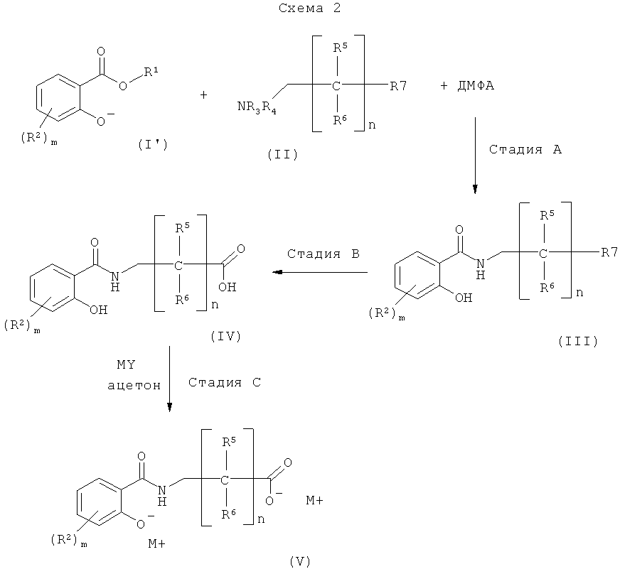 Изобретение относится к способу получения соединения общей формулы IV ! ! Способ, заключающийся в том, что (1) соединение формулы I взаимодействует ! ! с соединением формулы II ! ! в основных условиях, при которых фенольная гидроксигруппа по меньшей мере частично присутствует в депротонированной форме, в апротонном растворителе, с образованием соединения формулы III ! ! (2) при необходимости группу R7 превращают в карбоксигруппу, (3) при необходимости, продукт, полученный на стадии (1) или (2), обрабатывают кислотой с образованием соединения формулы IV. При этом n равно 1-8, m равно 1-4, R1 выбран из группы, включающей C1-C6 алкил с прямой или разветвленной цепью, карбокси-активирующую группу и пептидный конденсирующий реагент, каждый R2 может быть независимо выбран из группы, включающей -ОН, NR3R4, галоген, C1-C4 алкил, галоген (C1-C4) алкил, C1-C4 алкокси, C2-C4 алкенил, каждый R5 и каждый R6 независимо выбран из группы, включающей водород, -ОН, NR3R4, галоген, C1-C4 алкил, C1-C4 алкокси, С2-С4 алкенил, причем каждый R5 и каждый R6 необязательно идентичны, R3 и R4 каждый независимо выбран из группы, включающей водород, -ОН, C1-C4 алкил, галоген(С1-С4)алкил, C1-C4 алкокси, С2-С4 алкенил, a R7 означает карбоновую кислоту или любую группу, которую можно превратить в карбоксигруппу, например амид или нитрил. Технический результат - изобретение позволяет получить N-замещенные салициламиды, которые используются в составе композиций для доставки активных агентов в организм. 18 з.п. ф-лы.