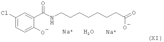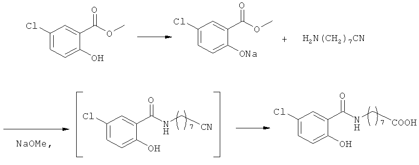 Настоящее изобретение относится к способу получения N-замещенных салициламидов или их производных, например их солей, гидратов и сольватов. Прежде всего настоящее изобретение относится к способу получения N-(5-хлорсалицилоил)-8-аминокаприловой кислоты (5-CNAC) и ее соответствующего моногидрата динатриевой соли. N-Замещенные салициламиды, полученные способом по настоящему изобретению, можно использовать в составе композиций для доставки активных агентов пероральным способом или другими способами введения в организм млекопитающих. Предпосылки создания изобретения Способы получения N-замещенных салициламидов известны, например показаны на схеме 1. Олигосалицилат получают из соответствующей салициловой кислоты после обработки уксусным ангидридом. Конденсацию аминокислоты проводят в присутствии основания, предпочтительно карбоната калия, в пригодном растворителе (например, диоксане). Выход обычно составляет приблизительно 50%. Типичным соединением, синтезированным способом, указанным в уровне техники, является 5-CNAC, который обычно используется в качестве системы доставки терапевтических агентов и в составе фармацевтических композиций. Краткое изложение сущности изобретения В настоящем изобретении, наряду с прочим, предлагается способ получения N-замещенных салициламидов, согласно которому салициловая кислота или салициловая кислота, в которой карбоксигруппа модифицирована, например, в виде сложного эфира или в виде производного, включающего пептидный конденсирующий агент (используемый в пептидном синтезе), в каждом случае с незащищенной фенольной гидроксигруппой, взаимодействует с амином в основной среде, т.е. в условиях, при которых фенольная гидроксгруппа по меньшей мере частично депротонируется, в протонном растворителе, например ДМФА (диметилформамиде). Карбоксигруппа в исходной салициловой кислоте обычно этерифицирована или модифицирована другим способом, например активирована. Кроме того, в изобретении предлагается способ получения соли N-замещенного салициламида, в которой N-замещенный салициламид взаимодействует с основанием, например с основанием щелочного металла, например салициламид взаимодействует с основанием в водном растворе, содержащем катион щелочного (или другого) металла. Обычно водный раствор представляет собой смесь ацетон/вода. Настоящее изобретение прежде всего относится к способу получения N-(5-хлорсалицилоил)-8-аминокаприловой кислоты (5-CNAC) и ее солей, прежде всего соответствующего моногидрата динатриевой соли. Способ включает взаимодействие метилового эфира 5-хлорсалициловой кислоты с аминооктановой кислотой (или ее производным, например аминооктаннитрилом) в основной среде в апротонном растворителе, например диметилформамиде. Основную среду получают при предварительном взаимодействии метилового эфира 5-хлорсалициловой кислоты с основанием, таким, например, как алкоголят, например NaOMe, или за счет добавления основания в реакционную смесь. Моногидрат динатриевой соли получают по реакции 5-CNAC с NaOH в смеси ацетон/вода. N-Замещенные салициламиды, прежде всего 5-CNAC, полученные способом по настоящему изобретению, можно использовать в составе композиций для доставки активных агентов пероральным способом или другими способами введения в организм млекопитающих. Следовательно, 