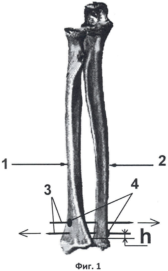 Способ заключается в следующем. Под проводниковой анестезией производят вправление вывиха путем надавливания на головку локтевой кости в положении кисти и предплечья между супинацией и пронацией. После этого в нижней трети обеих костей предплечья в поперечном направлении параллельно (см. Фиг.1) или крестообразно (см. Фиг.2) друг другу проводят две спицы Киршнера (3) с упорными площадками (4), сначала со стороны локтевой кости (2), а затем со стороны лучевой кости (1). При проведении спиц (3) параллельно нижнюю спицу проводят чуть выше места сочленения локтевой и лучевой костей (на определенную высоту h>0), чтобы исключить вводом спицы повреждение суставной поверхности. При этом стараются вводить спицы как можно ближе к дистальному лучелоктевому сочленению, чтобы спицами не нарушать функцию мышц предплечья.