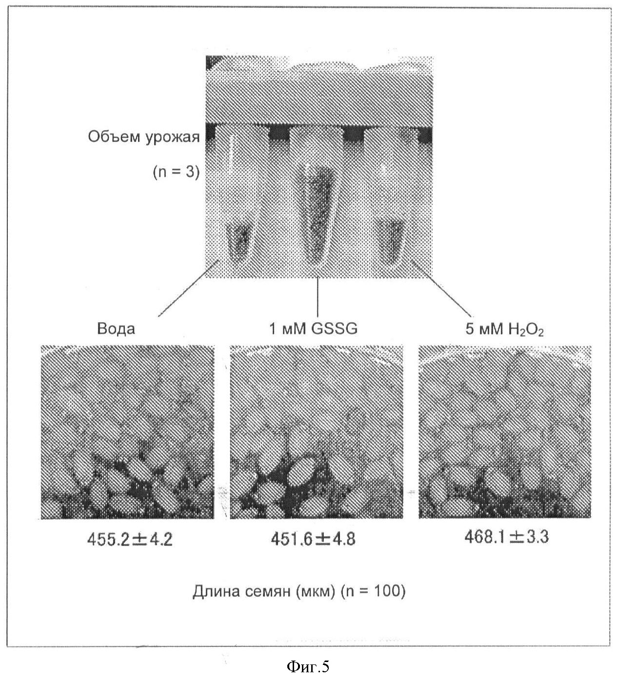 Область техники Настоящее изобретение относится к регуляторам роста растений и способам их применения. Более конкретно, настоящее изобретение касается регулятора роста растений, способного увеличить индекс урожайности (harvest index, процентное отношение массы урожая к общей массе растений) благодаря применению глутатиона, и способа применения регулятора роста растений. Уровень техники Деятельность человека традиционно тесно связана с применением растений, например, в таких областях как пищевое, декоративное производство, а также производство промышленных материалов, таких как бумага и химикаты, и топлива. Кроме того, в последнее время растительная биомасса привлекла внимание как источник биоэнергии, который может заменить использование ископаемого топлива. Несмотря на широкое использование растений в различных областях, их жизненные механизмы, такие как почкование, рост и цветение во многих аспектах еще не изучены. Как следствие этого, их культивирование в основном базировалось на опыте и интуиции, урожай растений сильно зависел при этом от природных условий, таких как погода. Поэтому изучение механизмов жизни растений, таких как почкование, рост и цветение, и регулирование и контроль этих механизмов очень важны не только для увеличения урожаев декоративных растений и пищевых растений, например зерновых и овощных культур, но и для лесоводства и биоэнергетики. Для регулирования роста растений использовали такие приемы как регулирование цветения с помощью искусственно создаваемых условий, например в оранжерее, или стимулирование роста за счет применения химикатов, таких как этилен. Однако большинство этих традиционных приемов базируется на опыте и интуиции, а не на данных, позволяющих произвести научную оценку роста растений. Принимая во внимание все вышесказанное, авторы настоящего изобретения исследовали механизмы почкования, роста и цветения. В результате авторы настоящего изобретения показали, что активные формы кислорода (ROS) имеют значение не только в качестве основы биосинтеза, но и как фактор контроля роста растений (см. источник 1 Патентной литературы). Конкретно, в источнике 1 Патентной литературы описан регулятор, который содержит вещество, регулирующее окислительно-восстановительное состояние клеток, и который способен регулировать дифференцировку клеток или органов; а также описан способ контроля дифференцировки и морфогенеза организма и образующийся таким образом организм. Далее в источнике патентной литературы 2 раскрывается адъювант, регулирующий рост растений и способ проведения редифференцировки растений с помощью адъюванта. Конкретно, каллюс, выделенный из части растения, например риса и евстомы, культивируется в редифференцированной культуральной среде, содержащей глутатион, предпочтительно окисленный глутатион (здесь и далее по тексту обозначается GSSG), так чтобы способствовать ризогенезу с эффективным получением в короткие сроки редифференцированной массы из каллюса. Перечень ссылок Источник патентной литературы 1 Patent Literature 1: Публикация международной заявки International Application Publication No. WO 01/080638 (Дата публикации 22 июля 2003 г.) Источник патентной литературы 2 Patent Literature 2: Публикация заявки на получение патента Японии, Tokukai, No. 2004-352679 А (Дата публикации 16 декабря 2004 г.) Сущность изобретения 