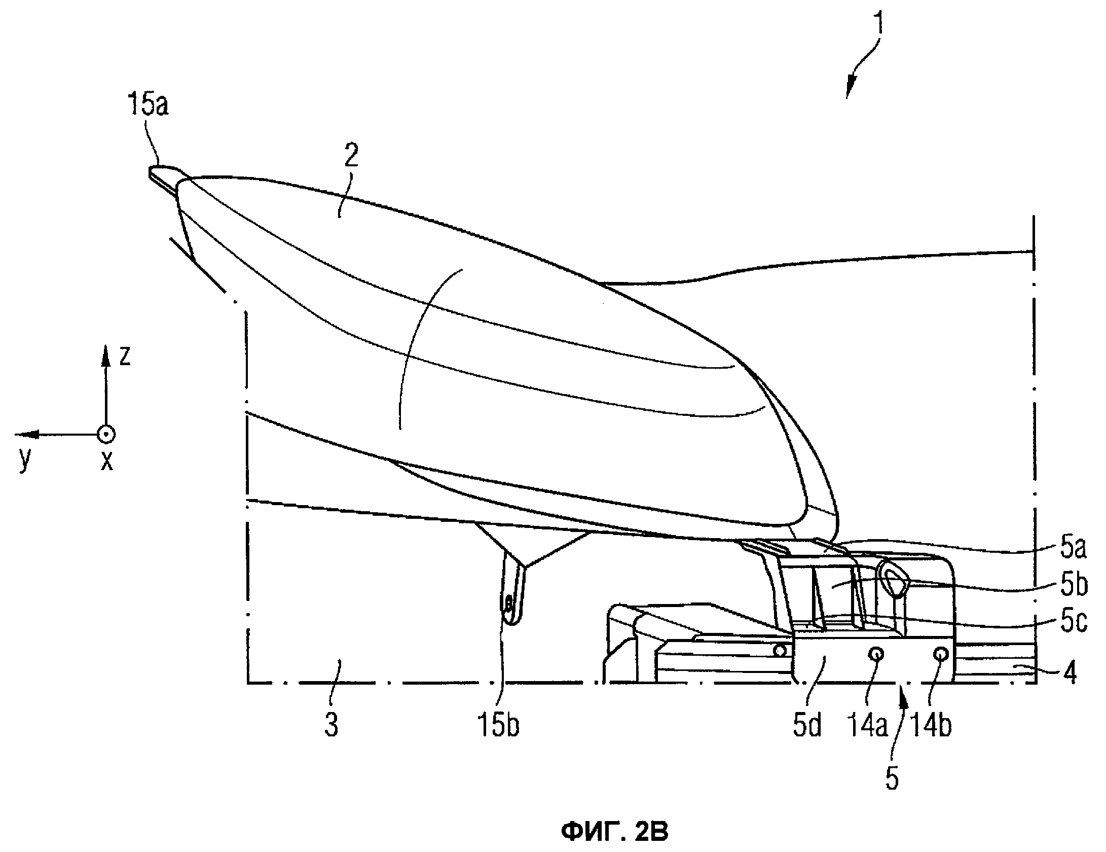 1. Конструкция (1) бампера в автомобиле, содержащая бампер (3), по меньшей мере один, по меньшей мере частично расположенный на бампере (3) корпус (2) фары, который жестко соединен с кузовом автомобиля, устройство (5) для позиционирования корпуса (2) фары относительно бампера (3) вдоль оси Z, имеющее 2. Конструкция бампера по п.1, отличающаяся тем, что ось Х расположена в продольном направлении автомобиля, а ось Z расположена в вертикальном направлении автомобиля. 3. Конструкция бампера по п.1 или 2, отличающаяся тем, что конструкция (1) бампера содержит держатель (4) бампера, который несет бампер (3), причем устройство (5) укреплено на держателе (4) бампера. 4. Конструкция бампера по одному из п.1 или 2, отличающаяся тем, что бампер (3) содержит второй запирающий элемент (11), который находится в зацеплении с первым приемным элементом (6) устройства (5), причем предусмотрена усиливающая часть (20), которая установлена на бампере (3) и которая содержит второй запирающий элемент (11), а второй запирающий элемент (11) имеет поперечное сечение (20а) в форме крюка и/или уголка. 5. Конструкция бампера по п.1 или 2, отличающаяся тем, что устройство содержит первое поперечное сечение в плоскости x-z, имеющее первый, второй и третий участки (5а, 5b, 5с), причем между первым и третьим участками (5а, 5с) расположен второй участок (5b), соединяющий первый и третий участки (5а, 5с), причем первый и третий участки (5а, 5с) развернуты относительно второго участка (5b) в противоположном направлении, причем первый участок (5а) содержит первый запирающий элемент (7) и/или третий участок (5с) содержит первый приемный элемент (6) и/или крепежный участок (12), на котором устройство (5) укреплено на держателе (4) бампера, и, по меньшей мере один из участков (5а, 5b, 5с) содержит усиливающее ребро (17а, 17b, 17с). 6. Конструкция бампера по п.4, отличающаяся тем, что первый приемный элемент (6) выполнен в виде выступа (21) для навешивания второго крепежного элемента (11). 7. Конструкция бампера по п.1 или 2, отличающийся тем, что первый запирающий элемент (6) устройства (5) выполнен в виде вставного элемента (24). 8. Конструкция бампера по п.1 или 2, отличающаяся тем, что корпус (2) фары содержит второй приемный элемент (10), который находится в зацеплении с первым запирающим элементом (7), причем второй приемный элемент (10) корпуса (2) фары выполнен в виде линейной направляющей (19), в которую с возможностью перемещения вставлен первый запирающий элемент (7), а линейная направляющая (19) проходит по существу в продольном направлении (х) автомобиля. 9. Конструкция бампера по п.1 или 2, отличающаяся тем, что устройство (5) содержит пластиковый материал и/или усиленный стекловолокном пластиковый материал. 10. Автомобиль с кузовом (4а), причем на кузове (4а) закреплена конструкция (1) бампера по оному из пп.1-9, и при этом передняя часть и/или задняя часть автомобиля имеет упомянутую конструкцию бампера.