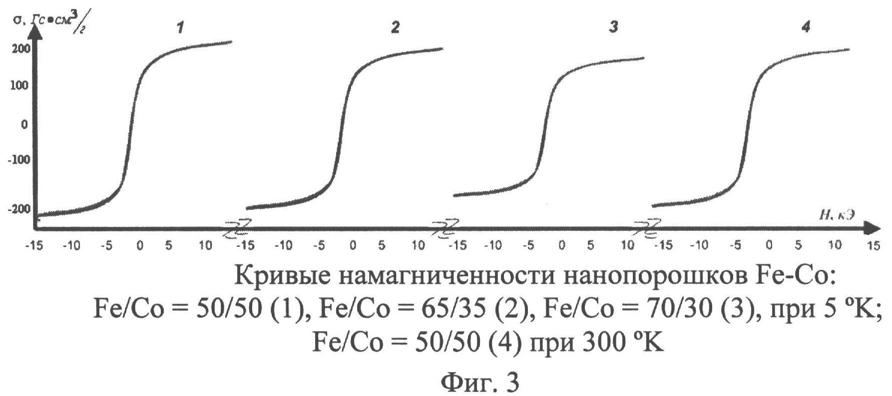 Изобретение относится к области получения наноразмерных порошков металлов группы железа, которые применяются в системах записи и хранения информации, в изготовлении магнитных сенсоров, используемых в медицине и биологии и др. Способ включает приготовление раствора солей гептагидрата сульфата железа и гексагидрата хлорида кобальта, его нагрев, осаждение щелочью металлов в виде гидроксидов железа и кобальта при непрерывном перемешивании, при этом в ходе перемешивания для осаждения гидроксидов железа и кобальта в раствор вводят 20-25 г твердой щелочи сухого гидроксида натрия, после чего в раствор добавляют 20-40 мл раствора 65 мас.% гидразин гидрата и выдерживают в течение 5-20 минут. Технический результат - получение нанопорошка железо-кобальт в виде твердого раствора, не содержащего окисно-гидроокисных соединений и диамагнитных примесей. 2 з.п. ф-лы, 1 табл., 3 ил.