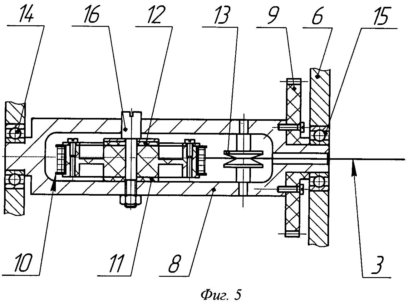Механизм (см. фиг.5) смотки непрерывного керна 3 состоит из шпинделя 8, ведомого элемента 9, выполненного в виде зубчатого колеса, катушки 10, упруго-тормозных элементов 11 и 12, направляющего ролика 13. Шпиндель 8, соединенный с ведомым элементом 9, установлен на станине 6 с помощью подшипниковых опор 14 и 15. Катушка 10 установлена на оси 16, закрепленной в шпинделе 8.