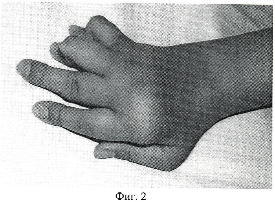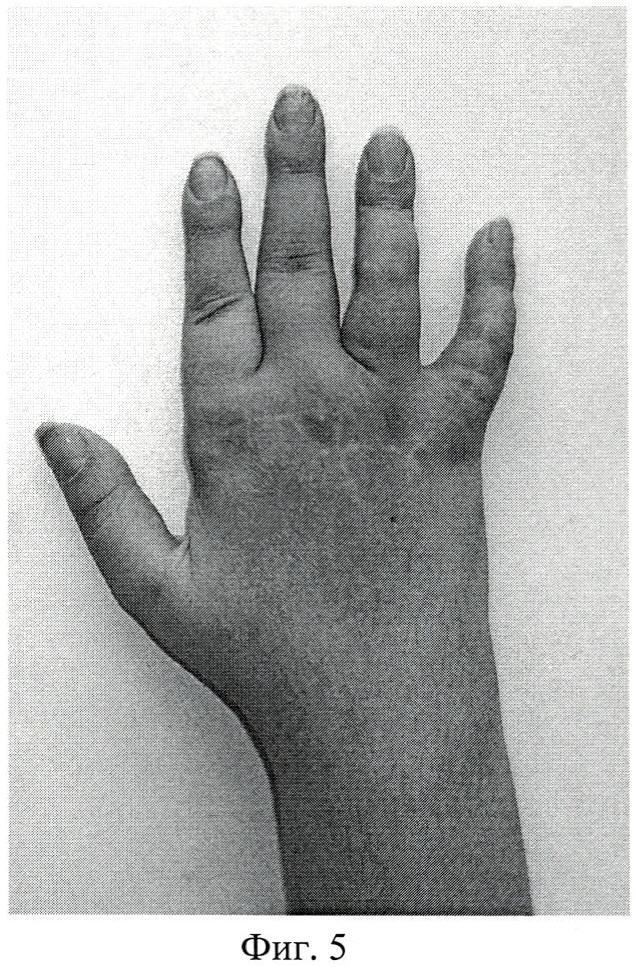 Изобретение относится к медицине, а именно к травматологии и ортопедии, и может быть использовано для устранения ульнарной девиации трехфаланговых пальцев кисти при ревматоидном артрите. При прогрессировании заболевания в результате синовита пястно-фаланговых суставов происходит поражение их капсульно-связочного аппарата, что приводит к типичной девиации трехфаланговых пальцев в локтевую сторону. Для устранения ульнарной девиации трехфаланговых пальцев кисти при ревматоидном артрите выполняется оперативное вмешательство, заключающееся в укорочении лучевой коллатеральной связки пястно-фаланговых суставов Das Gupta К, Haussmann P. Handchir Mikrochir Plast Chir. 2005 Feb; 37 (1):35-9. После выполнения синовэктомии пястно-фалангового сустава из тыльного доступа выделяется удлиненная лучевая коллатеральная связка, производится ее отсечение проксимально, укорочение и реинсерция. Эта операция является прототипом предлагаемого нами способа. Данное оперативное вмешательство имеет существенное ограничение - пораженная воспалительным процессом лучевая коллатеральная связка пястно-фалангового сустава не всегда обладает должными прочностными свойствами, а при длительном течении ревматоидного артрита встречается ее полная утрата. Техническим результатом изобретения является восстановление оси трехфаланговых пальцев и улучшение функции кисти. Результат изобретения достигается за счет создания аллосухожильных блоков между глубокой поперечной пястной связкой и основной фалангой каждого из пальцев с трансоссальной фиксацией на лучевой стороне, а при необходимости коррекции положения 2 пальца вместо глубокой поперечной пястной связки используется сухожилие первой тыльной межкостной мышцы проксимальнее уровня пястно-фалангового сустава. На чертежах изображены: Фигура 1: схема создания аллосухожильных блоков между основными фалангами трехфаланговых пальцев и глубокой поперечной пястной связкой. Фигура 2: внешний вид кисти пациентки О. до операции. Фигура 3: рентгенограмма кисти пациентки О. до операции. Фигура 4: рентгенограмма кисти пациентки О. после операции. Фигура 5: внешний вид кисти пациентки О. после курса реабилитации. Предлагаемый нами способ заключается в следующем: операция выполняется под проводниковой анестезией, в положении пациента на спине. Под жгутом выполняют поперечный разрез по тыльной поверхности кисти на уровне пястно-фаланговых суставов. Осуществляют доступ к каждому из пораженных суставов, выполняют синовэктомию. Осуществляют доступ к зоне прикрепления лучевой коллатеральной связки на основной фаланге каждого из пораженных трехфаланговых пальцев. Сухожильные аллотрансплантаты длиной 3-4 см помещают в зону реконструкции и фиксируют трансоссально на лучевой стороне основных фаланг на уровне их оснований. Между головками пястных костей осуществляется доступ к глубокой поперечной пястной связке. Сухожильные аллотрансплантаты от 3, 4 и 5 пальцев проводятся под глубокой поперечной пястной связкой с лучевой стороны от каждого сустава соответственно и ушиваются с натяжением, достаточным для удержания пальца в правильном положении. Проверяется возможность свободных пассивных движений в пястно-фаланговых суставах. В случае необходимости коррекции ульнарной девиации 2 пальца сухожильный аллотрансплантат от е