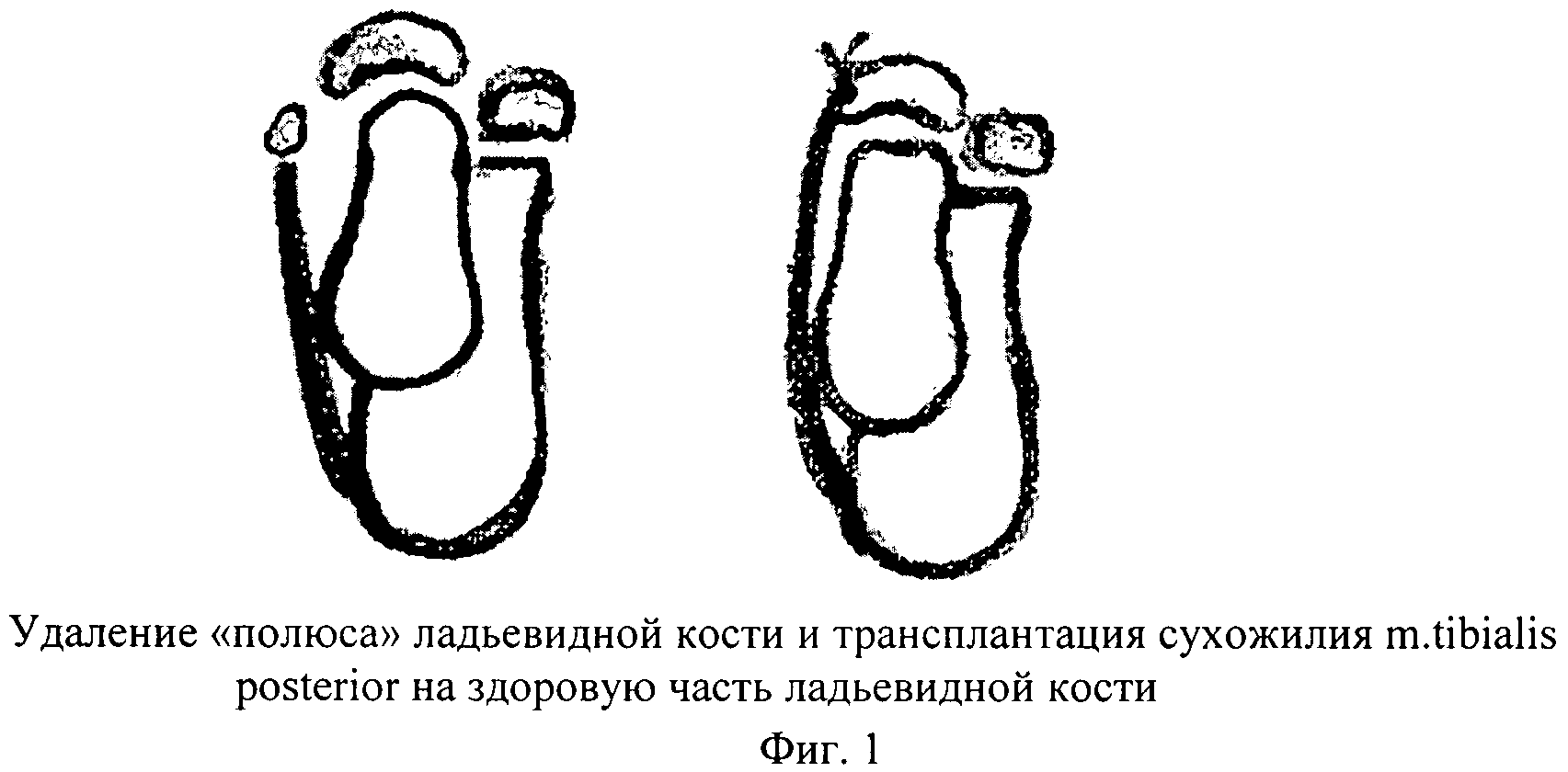 Изобретение относится к медицине, а именно к травматологии и ортопедии, и может быть использовано при лечении остеохондропатии ладьевидной кости стопы, не поддающейся консервативному методу. Известен способ лечения эквино-варусной деформации стоп при артрогрипозе (Баталов О.А. Патент RU №95103713 А1, от 27.01.1997 г.), заключающийся в том, что выделяют сухожилие задней большой берцовой мышцы, отсекают его от места прикрепления и фиксируют к проксимальному концу ахиллова сухожилия. Из разреза на подошвенной поверхности стопы отсекают сухожилие мышцы, отводящей первый палец от пяточного бугра, раны ушивают и накладывают аппарат Илизарова. Известен также другой способ оперативного лечения наружного отклонения первого пальца стопы (Баталов О.А., Тенилин Н.А. Патент RU №99103378 А, от 10.12.2000 г.). Лечения наружного отклонения первого пальца стопы проводят путем резекции остеофита головки первой плюсневой кости и клиновидной вальгизирующей остеотомии ее проксимального метафиза, отличающийся тем, что дополнительно выполняют капсулотомию наружного отдела первого плюснефалангового сустава с отсечением порций сухожилий поперечной и косой головок мышцы, отводящей первый палец, прикрепленных к основанию его проксимальной фаланги. Наиболее близким по техническому решению к заявленному способу и выбранным в качестве прототипа является материал для остеопластики на основе обработанных обезжиренных трупных костей человека (Малахов О.А., Белых С.И., Сухих Г.Т., Кожевников О.В., Лекишвили М.В., Давыдов А.Б., Малахова С.О. RU №2227037 С2, от 20.04.2004 г.), материал лиофилизированной губчатой костной ткани с размерами пор от 0,05 до 5 мм, на поверхность которой нанесена композиция из биосовместимого сополимера и физиологически активных веществ при следующем соотношении компонентов в композиции, мас.%: Биосовместимый сополимер винилпирролидона с акрилатами 50-99 Физиологически активные вещества 1-50, при этом соотношение пористой костной ткани и физиологически активной полимерной композиции составляет, мас.%: Костная ткань 60-99,3 Физиологически активная полимерная композиция 0,7-40 Однако данные способы технически сложны, и в тоже время мы встретились с рядом случаев, когда указанные рекомендации не привели к желаемому исходу. Технический результат - оперативное устранение патологического процесса в медиальном полюсе ладьевидной кости в случаях, когда он не поддается консервативной терапии. Техническое решение заключается в удалении очага дистрофии ладьевидной кости и транспозиции сухожилия задней большеберцовой мышцы на здоровые отделы ладьевидной кости. Способ осуществляется следующим образом. В положении больного на спине полуовальным разрезом над проекцией медиального полюса ладьевидной кости стопы послойно обнажают костный фрагмент, не консолидировавшийся с материнской основой ладьевидной кости, и острым путем удаляют. Сухожилие задней большеберцовой мышцы прошивают капроновой или иной прочной нитью, подтягивают к материнскому ложу ладьевидной кости и фиксируют к последней интраоссально способ изображен на фиг.1 - удаление «полюса» ладьевидной кости и трансплантация сухожилия m.tibialis posterior на здоровую часть ладьевидной кости. При этом продольный свод всегда углубляется. Послойные швы на рану. Стопу в данном положении фиксируют путем восстановител