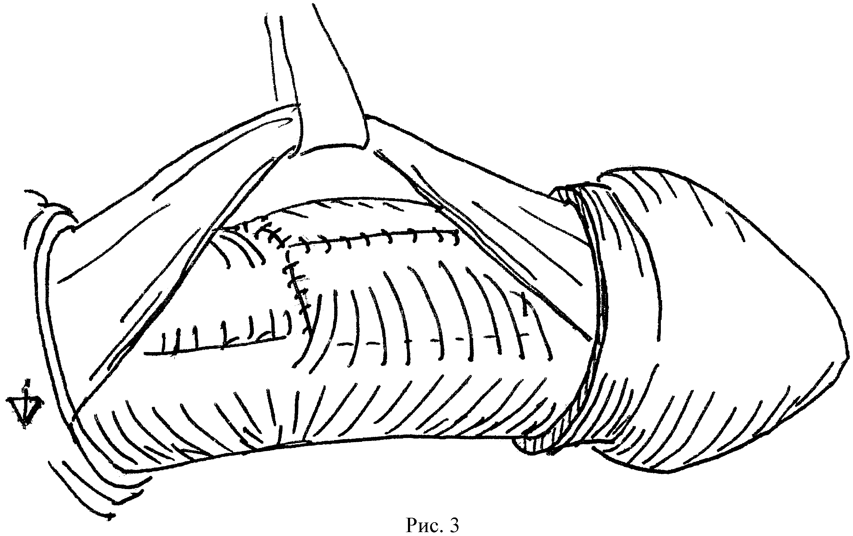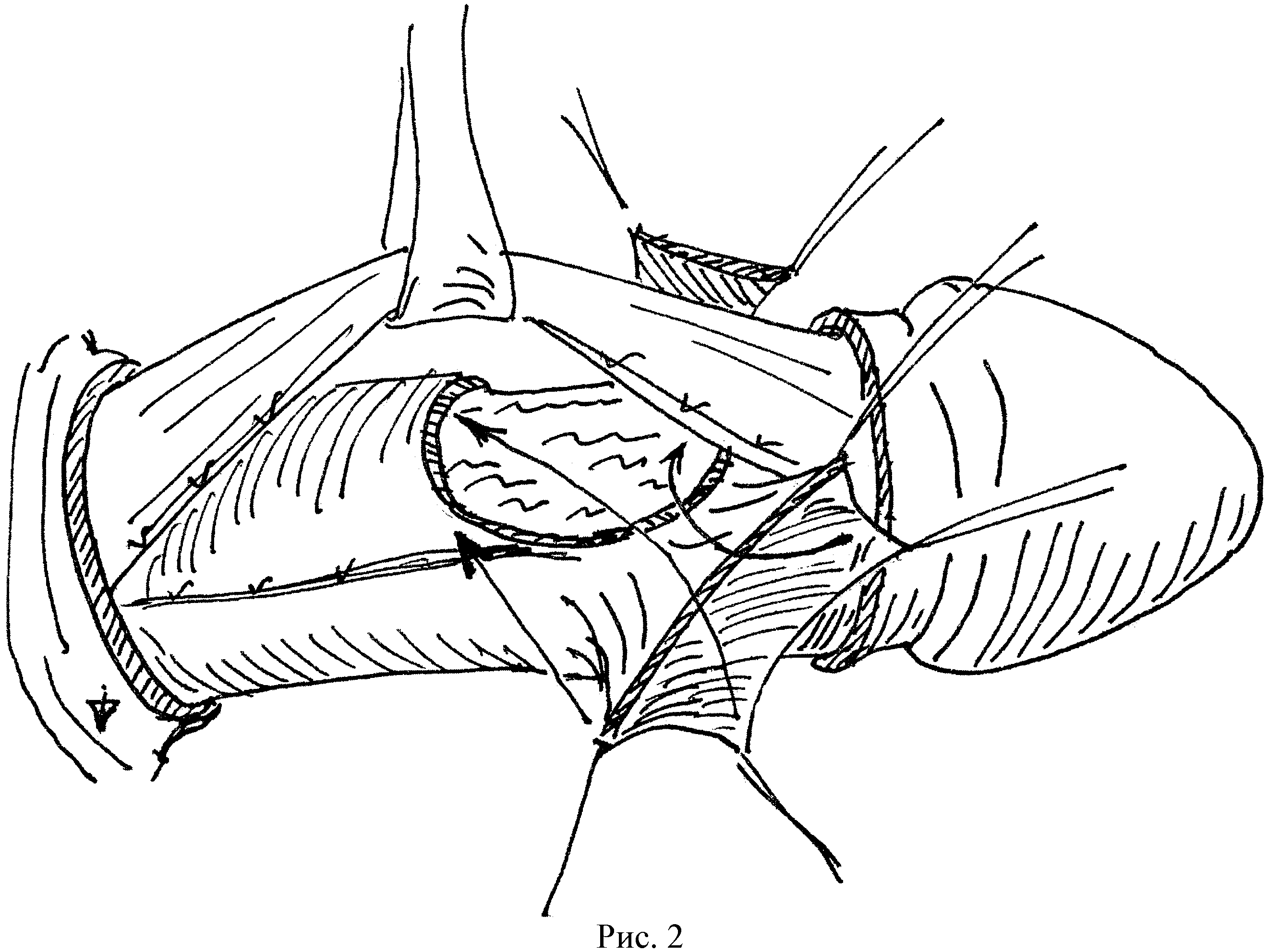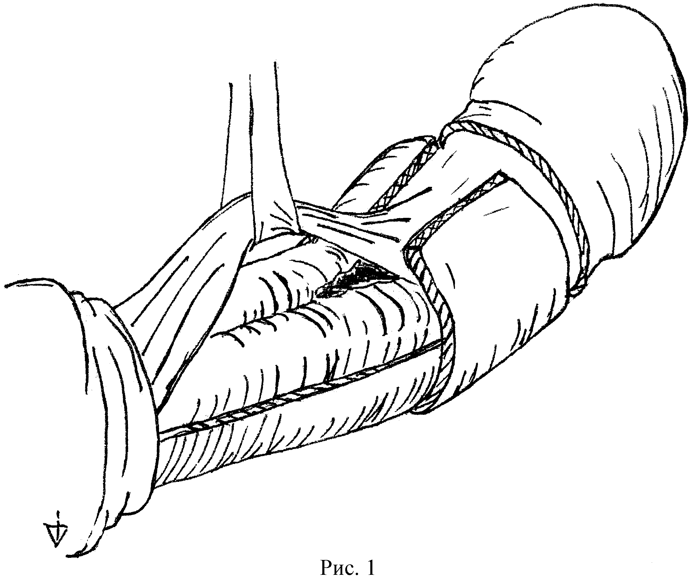 Изобретение относится к медицине, а именно к хирургическим способам лечения болезни Пейрони, в частности, с использованием трансплантантов белочной оболочки полового члена, и может широко использоваться в андрологии. Болезнь Пейрони или фибропластическая индурация полового члена - это заболевание, которое проявляется наличием одиночных или множественных уплотнений в соединительной ткани белочной оболочки, так называемые бляшки. По данным различных авторов, имеет незначительную распространенность: от 0,3 до 2% (М.В.Lindsay et al., 1991; G.H.Jordan, S.M.Schlossberg, C.J.Devine, 1998). Фибропластические изменения приводят к угловой деформации и болевому синдрому при возникновении эрекции, что не позволяет провести половой акт, или крайне затрудняют его проведение. Болезнь Пейрони чаще встречается у мужчин в возрасте от 20-60 лет. К симптомокомплексу относится: наличие бляшки, искривление полового члена, болезненная эрекция, какой-то из симптомов может быть превалирующим. При болезни Пейрони отмечается локальная дезорганизация циркулярных и продольных слоев белочной оболочки, а также разрывы эластина, уменьшение его содержания при одновременном увеличении коллагена, что и приводит к искривлению полового члена в момент эрекции. Разработанные и применяемые методы лечения болезни Пейрони делятся на две группы: консервативные и оперативные. Консервативные: • Инъекции стероидных препаратов в бляшку. • Экстракорпоральная ударно-волновая терапия. • Физиотерапевтические методы. Оперативные: • Корпоропластика. • Выправляющая корпоропластика за счет трансплантата. • Фалоэндопротезирование. Консервативная терапия болезни Пейрони весьма вариабельна, что связано с невысокой степенью ее эффективности. Консервативные методики (введение в бляшку гормонов и т.д.) приводят только к незначительному временному эффекту, усугубляют патологический процесс. Из инъекционных препаратов, вводимых в бляшку, были предложены также верапамил, интерферон и орготеин. Однако применение препаратов, непосредственно вводимых в бляшку, приводит к значительным положительным результатам, но их использование сопряжено с токсическим действием на организм и индивидуальной непереносимостью. Препарат Орготеин довольно эффективен, но его применение сопряжено с высокой токсичностью, в ряде стран его применение запрещено (G.Bartsch, K. Menander-Huder, 1981 г.). В последнее время в урологических клиниках все шире стали пользоваться для разрушения бляшек традиционными приборами для камнедробления. Первоначально получаемые результаты экстракорпоральной ударно-волновой терапии расцениваются исследователями как обнадеживающие (Y.Abdel-Salam et al., 1999; Т.Lebret et al., 2000; E.W.Haucks et al., 2000; J.Husain et al., 2000; M.S.Mishel et al., 2003; О.И.Пакус, 2005). Тем не менее применение ударноволновой терапии не получило широкого распространения (V.Mirone, C.Imbimdo et al., «A new biopsy technigue to inverstigate Perronies disease associated histological alterations: results in two different forms of terapy», Eur.Urol. 2002). Имеются данные о комплексной терапии применения верапамила и антиоксидантов в комбинации с литотрипсией (Аляев Ю.Г., Рапопорт Л.М., Щеплев П.А. Комбинированная терапия фибропластической индурации полового члена. Андрология и генитальная хир., 2003). В настоящее время признано использование медикаментозной терапии лишь в острую воспалительную фазу. В хроническую фазу, в фазу стабилизации процесса более 